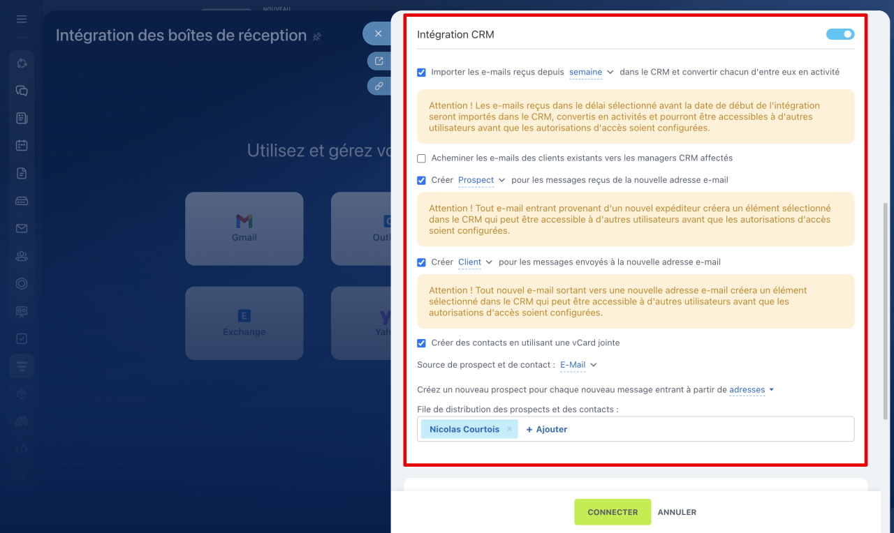 3. Configurez l'intégration avec le CRM : déterminez si un e-mail provenant d'une nouvelle adresse doit créer un prospect ou un contact. Assignez les responsables pour ces nouveaux prospects et contacts.