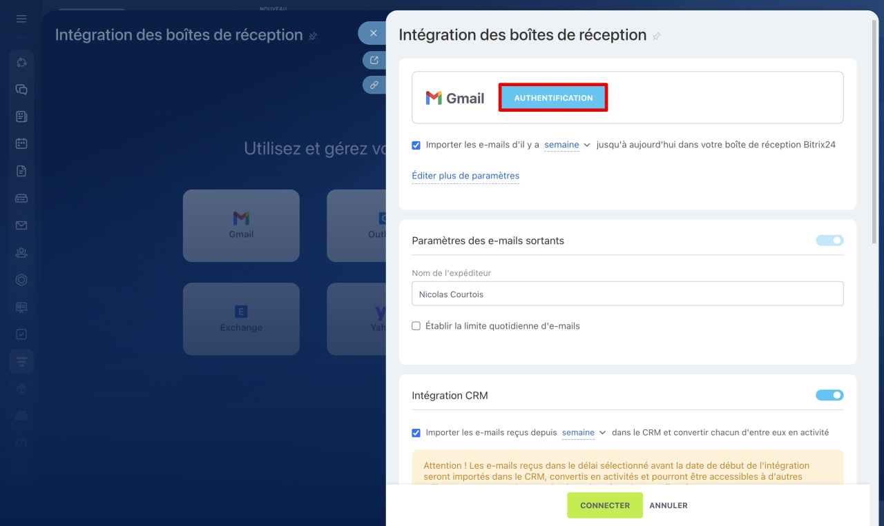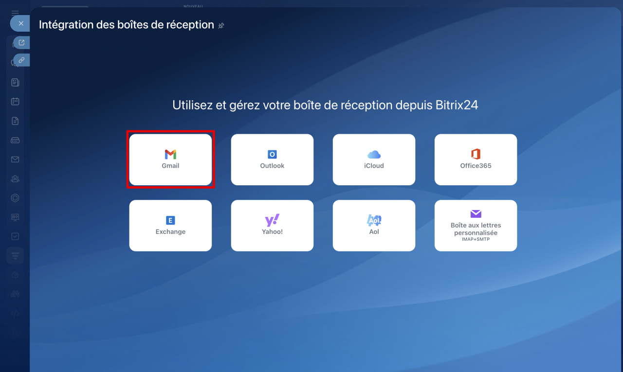 - Vous pouvez connecter une boîte de réception Gmail à Bitrix24. Les e-mails seront directement acheminés vers Bitrix24, où vous pourrez y répondre, associer les conversations à des tâches, en discuter avec vos collègues dans le chat ou encore créer des prospects et des transactions dans le CRM.