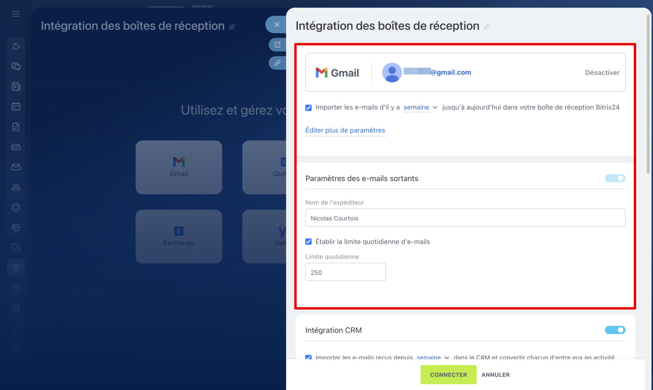 2. Définissez une limite d'envoi quotidienne pour éviter de dépasser les restrictions de Gmail et celles de votre offre Bitrix24, et pour réduire le risque que vos e-mails soient marqués comme indésirables (spam).