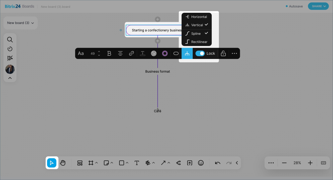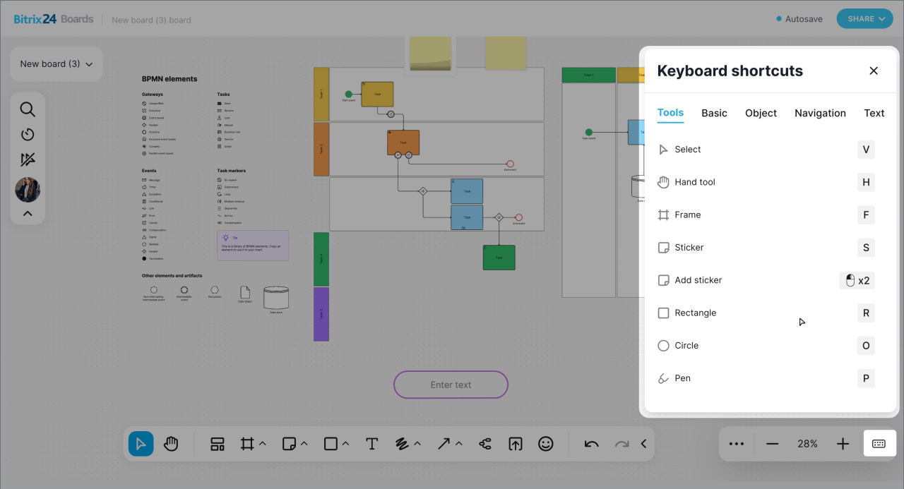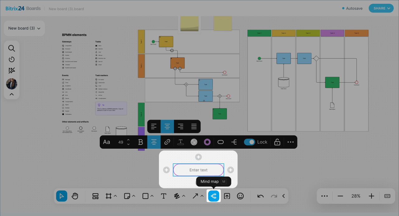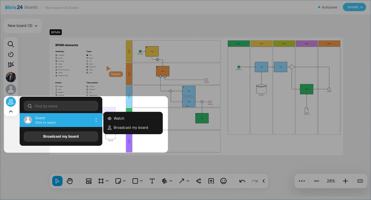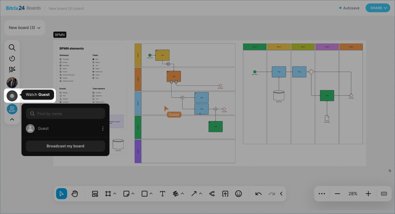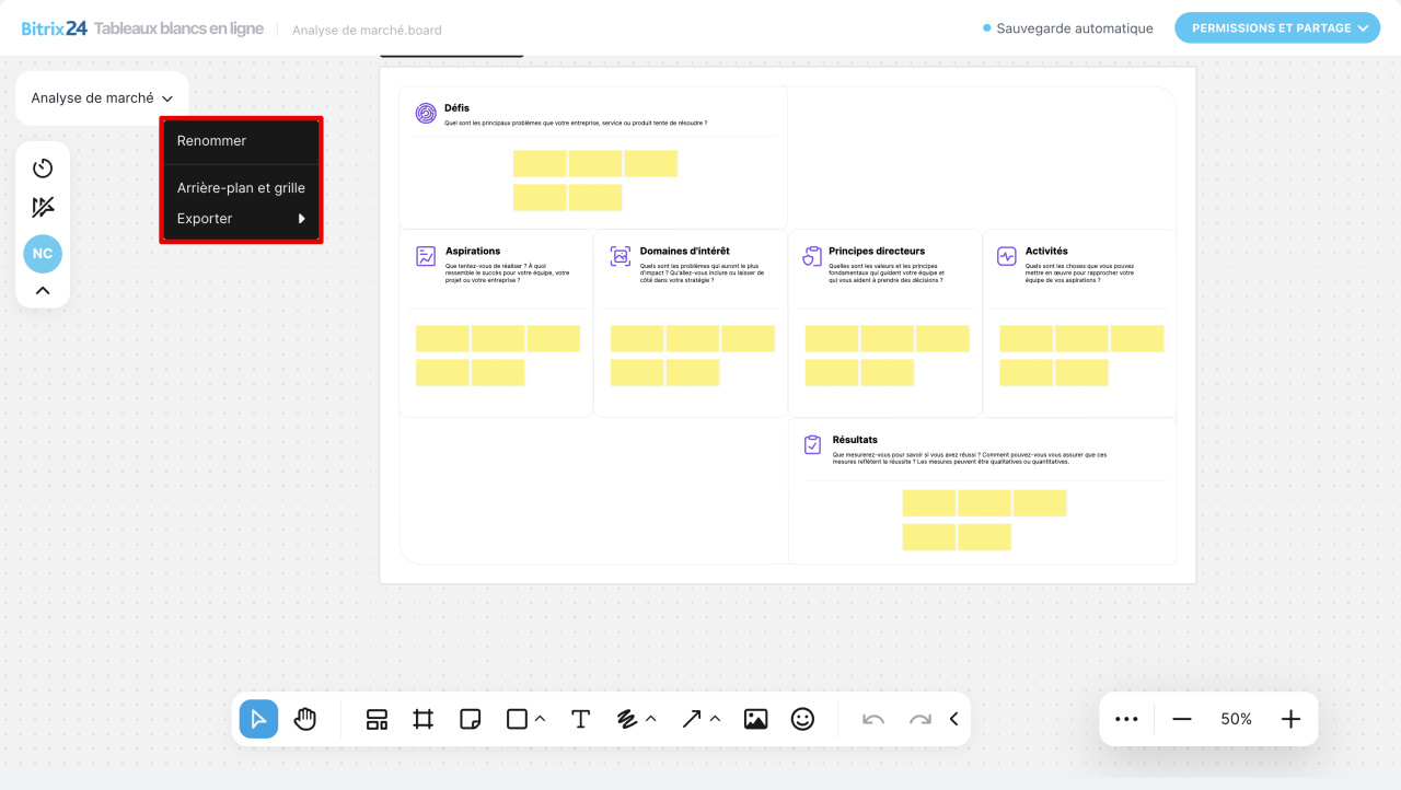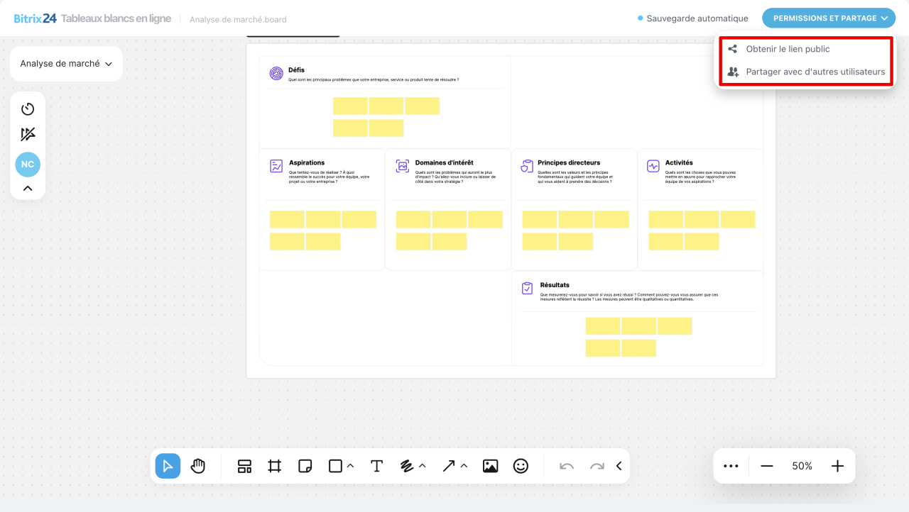 - Les tableaux blancs en ligne Bitrix24 sont des espaces de collaboration. Une équipe peut y rassembler des idées, discuter de conceptions, planifier des présentations et suivre des processus - sans avoir recours à des services externes.