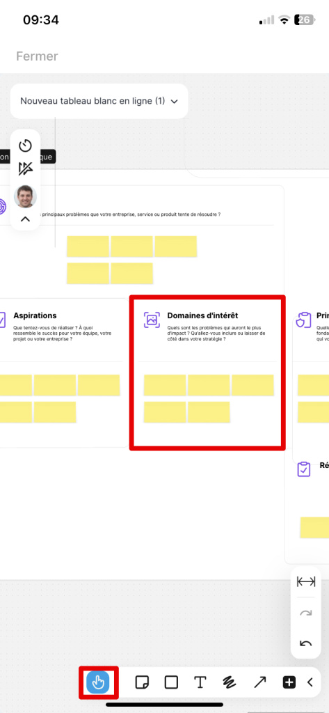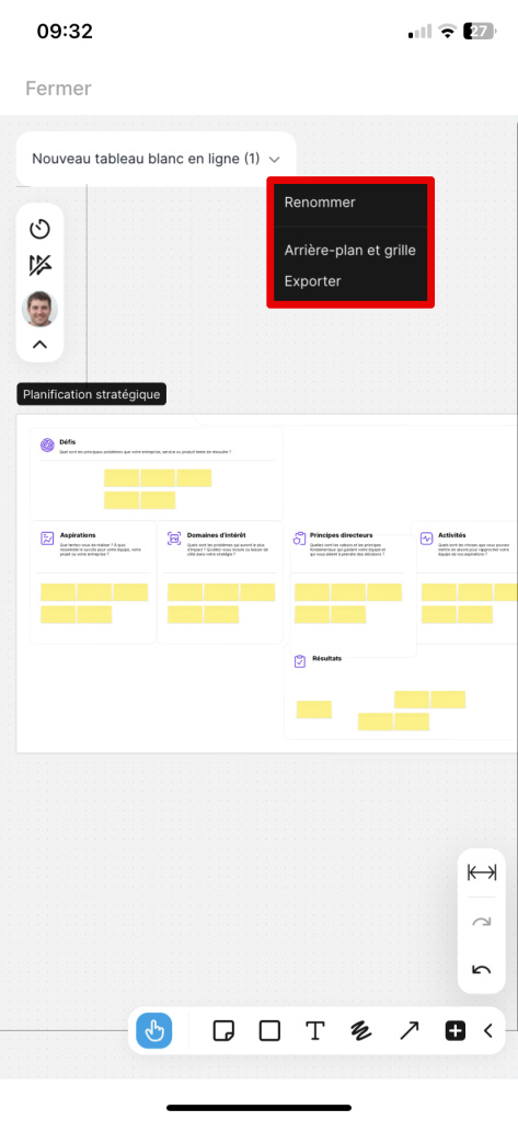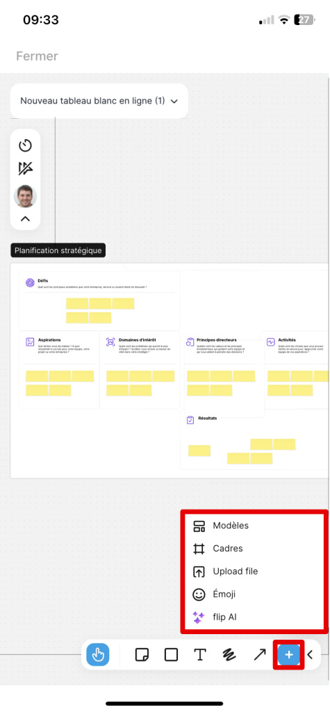 Dans l’application mobile, vous pouvez travailler sur un tableau comme sur ordinateur : créer des organigrammes, ajouter des légendes, des émojis et des notes adhésives, etc. La barre d’outils se situe en bas de l’écran - appuyez sur ➕ pour l’ouvrir.