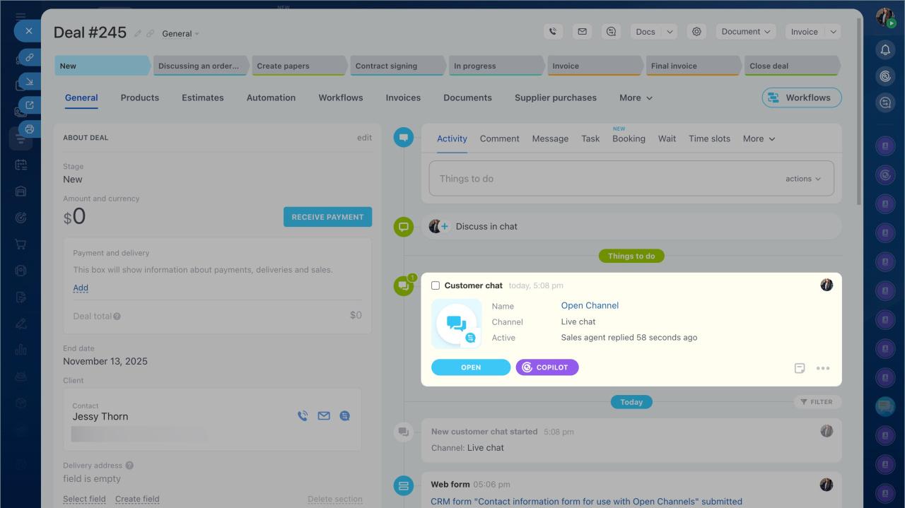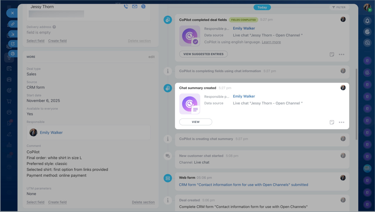 Ouvrez le formulaire CRM, sélectionnez le chat dans la chronologie qui nécessite une analyse, puis cliquez sur le bouton CoPilot.