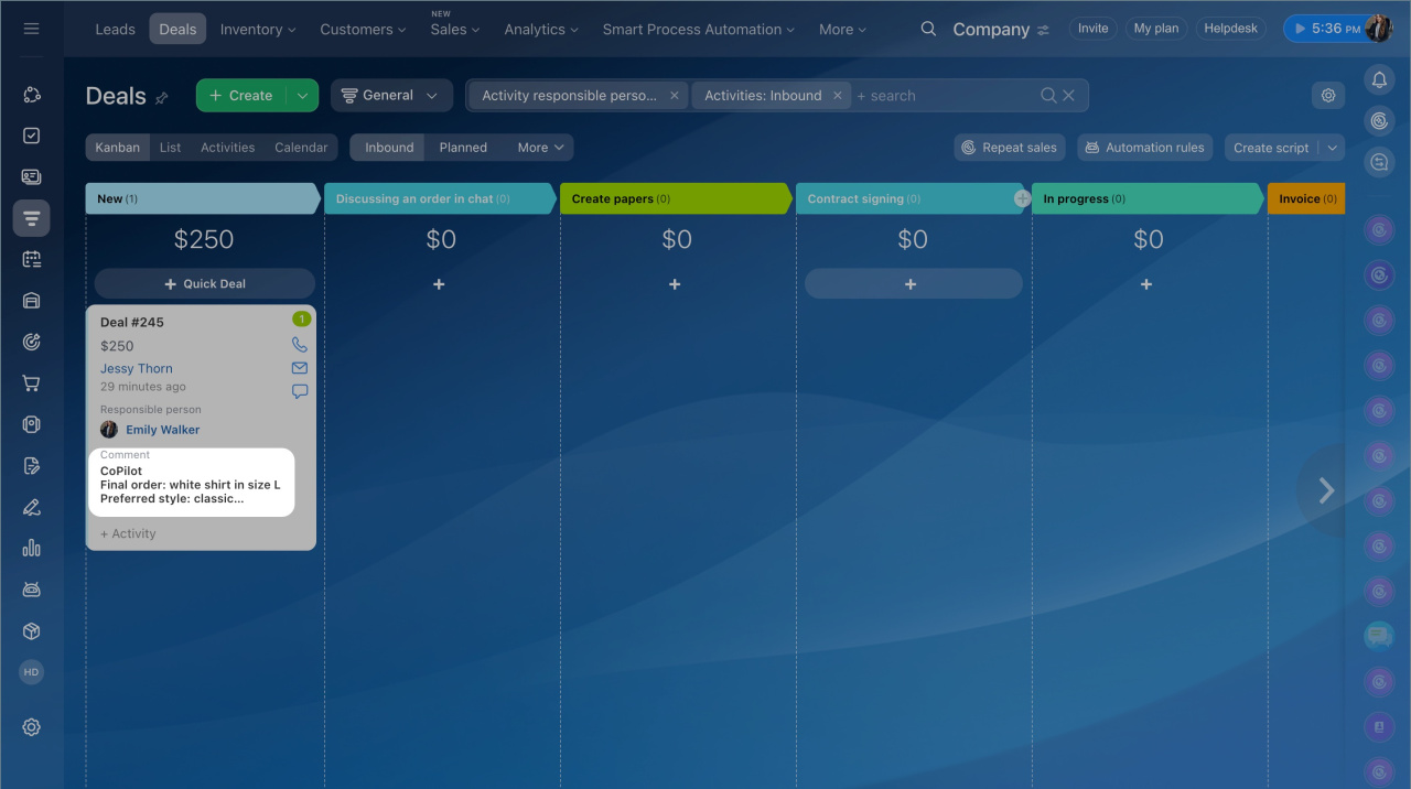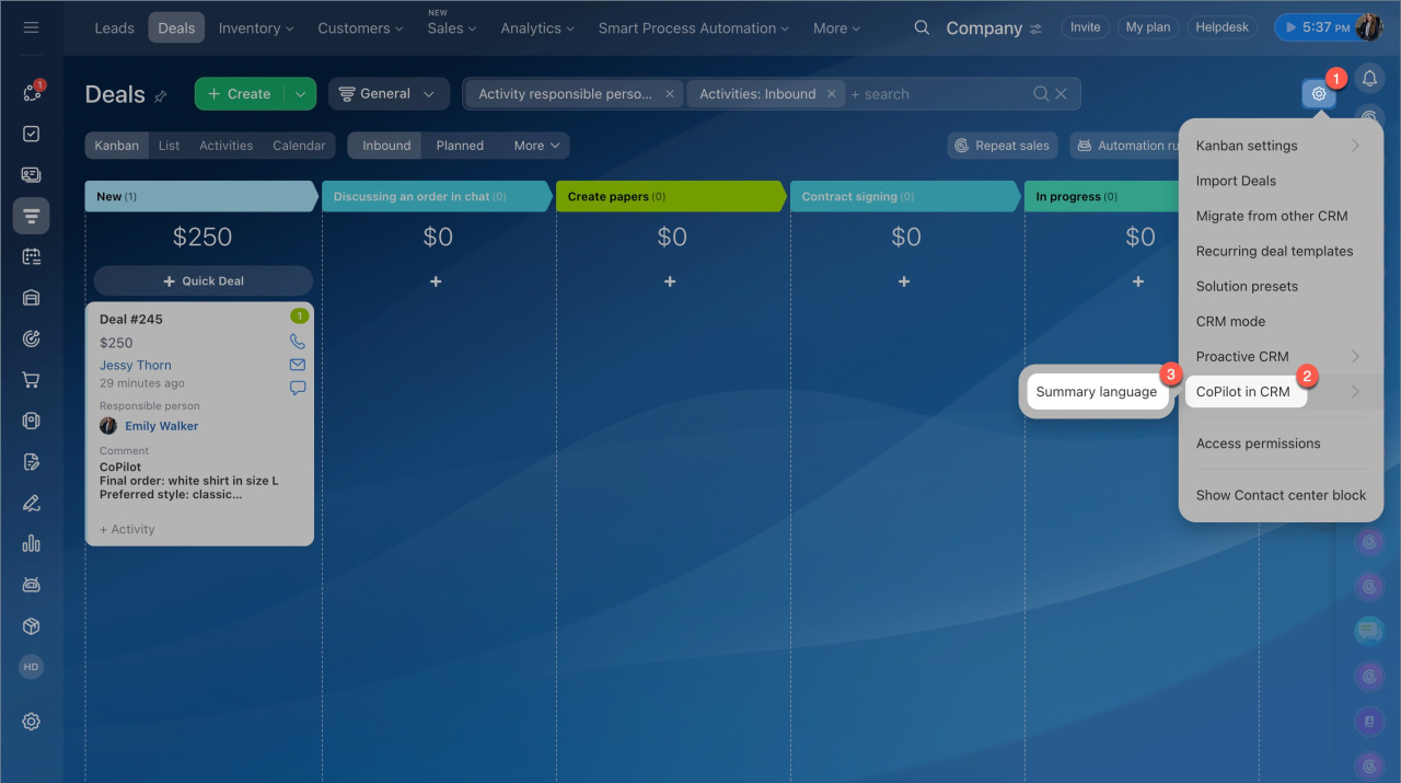 - Activez CoPilot dans le CRM dans les paramètres de Bitrix24.