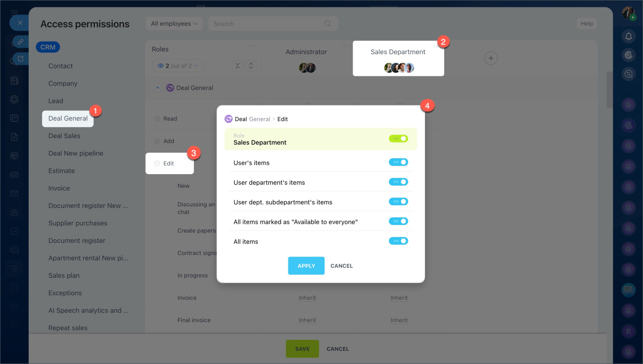 - Accordez à l'employé les permissions d'accès pour modifier les éléments CRM. Par exemple, pour traiter une discussion dans une transaction, il doit avoir les permissions pour modifier les transactions.