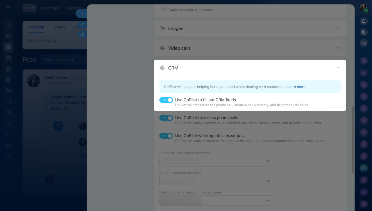 - Accédez à la section CRM - Paramètres - CoPilot dans le CRM.