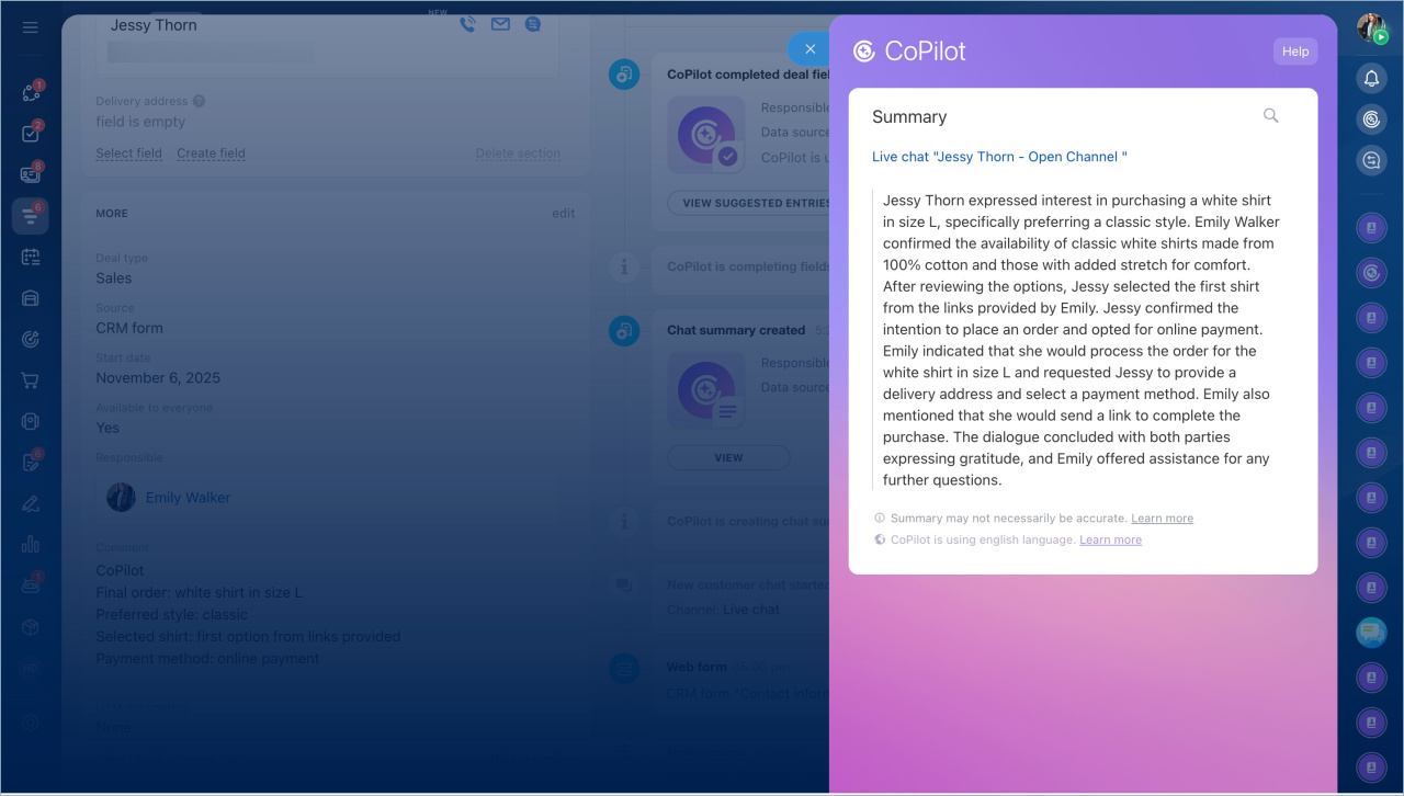 - Vous pouvez sélectionner la langue pour que CoPilot crée le résumé de la conversation et remplisse les champs du formulaire CRM.