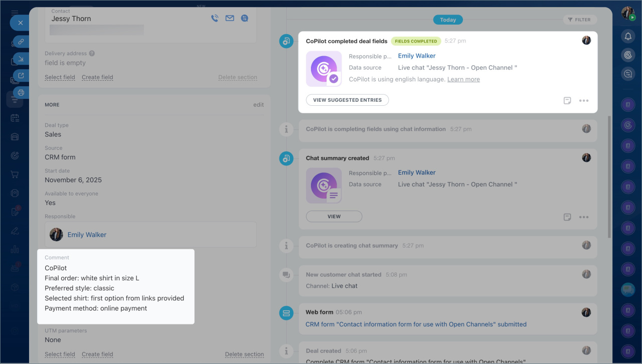 - CoPilot remplit automatiquement les champs vides du formulaire CRM avec les données issues du chat.