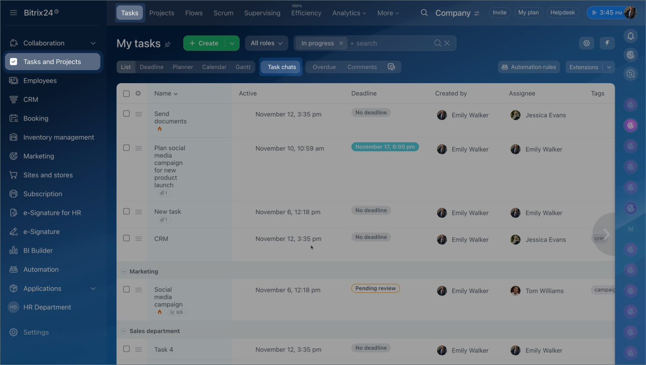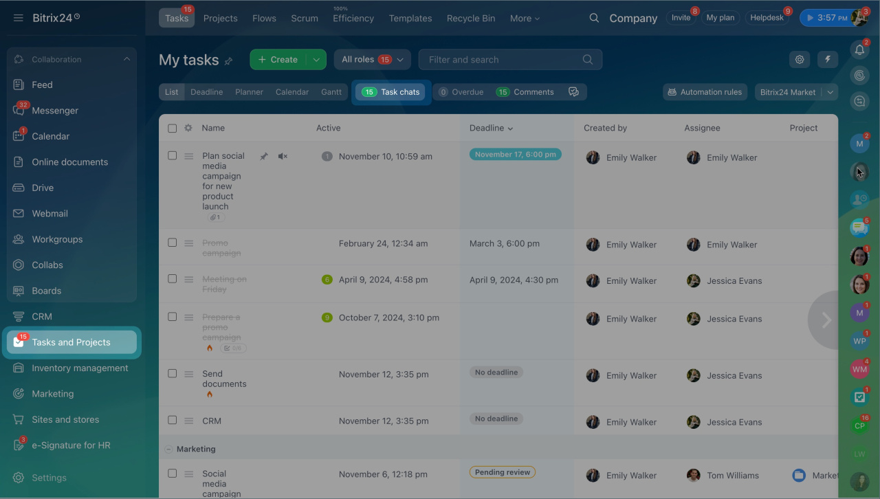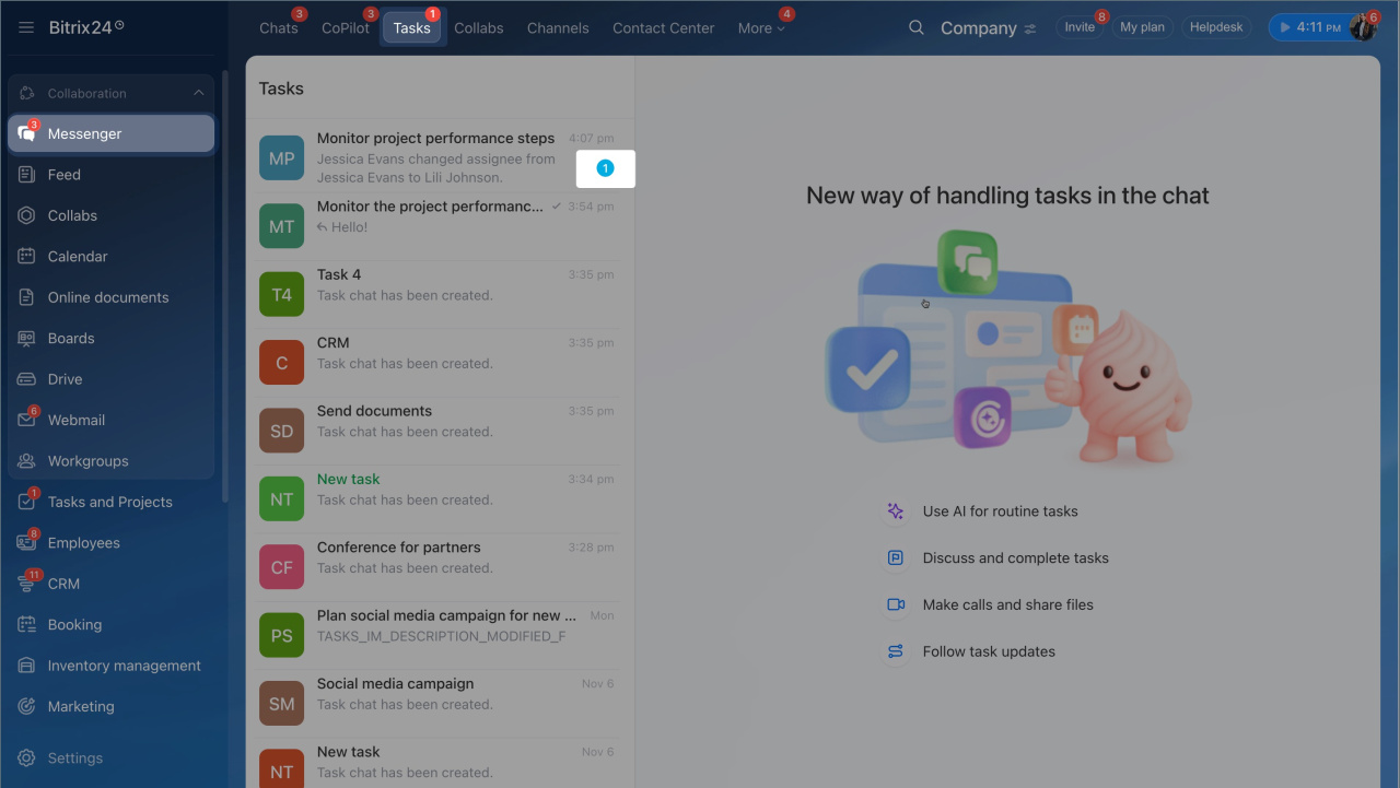 Les nouvelles tâches ne sont pas seulement une mise à jour, mais une nouvelle façon de travailler. Désormais, tout ce qui est nécessaire pour leur réalisation est rassemblé au même endroit. Le chat de tâche est devenu le centre de gestion des tâches. C'est ici que l'équipe discute des détails, prend des décisions et suit les changements en temps réel. Le travail avance plus rapidement, et Bitrix24 vous aide à mener les tâches à bien.