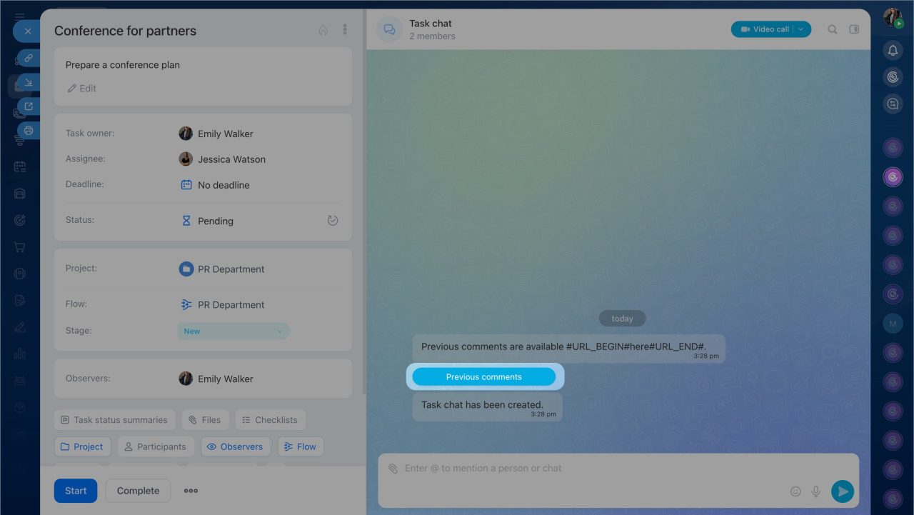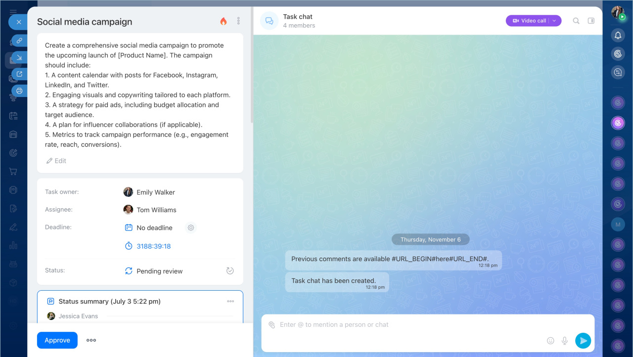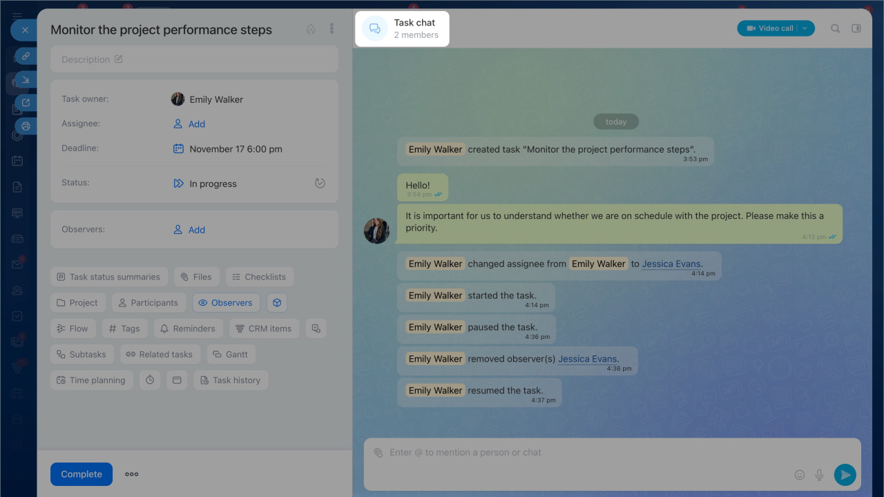 - Suivre les modifications - chaque étape est enregistrée dans le chat : modifications des dates limites ou mises à jour du statut. Cela permet de surveiller rapidement ce qui a changé et l'état actuel de la tâche.