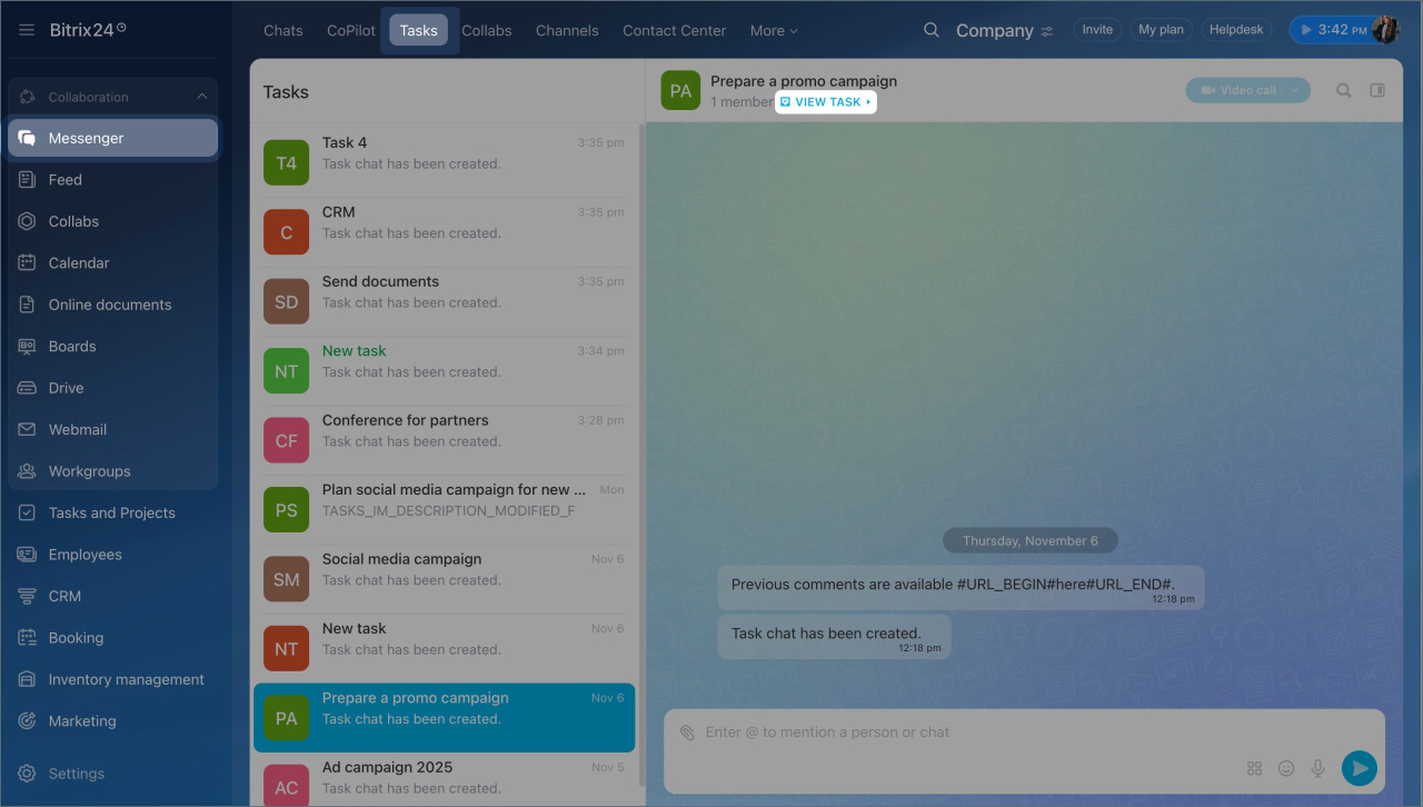 Vous pouvez accéder à la liste des chats de tâches dans la section Messenger - Tâches et dans Tâches et projets - Chats de tâches.
