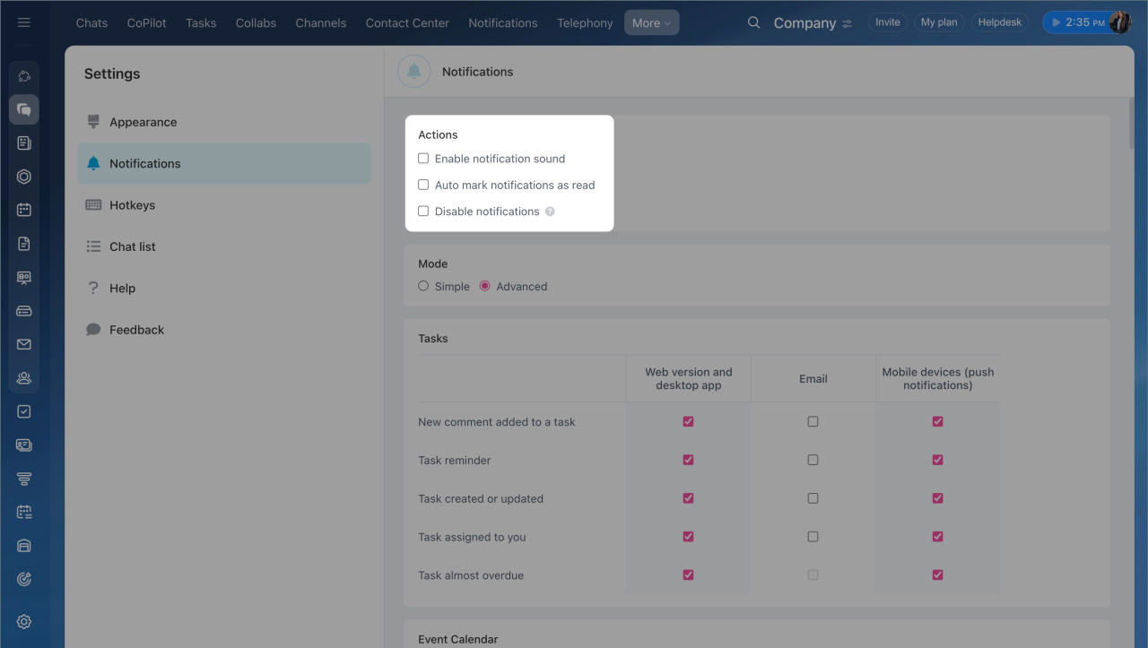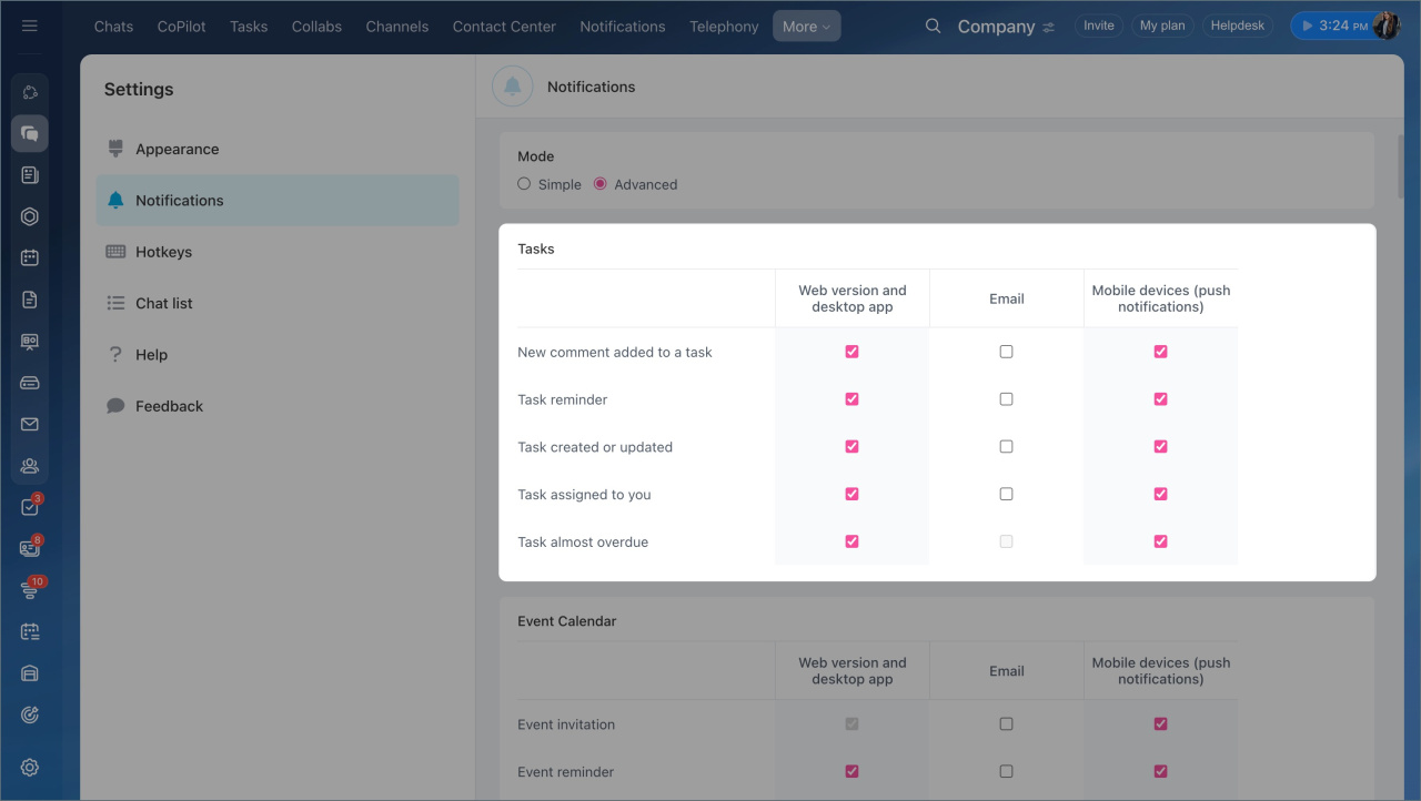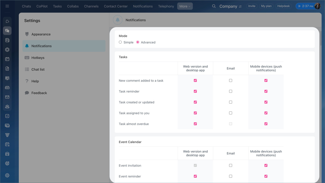 - Avancé - les notifications peuvent être personnalisées individuellement pour chaque outil Bitrix24.