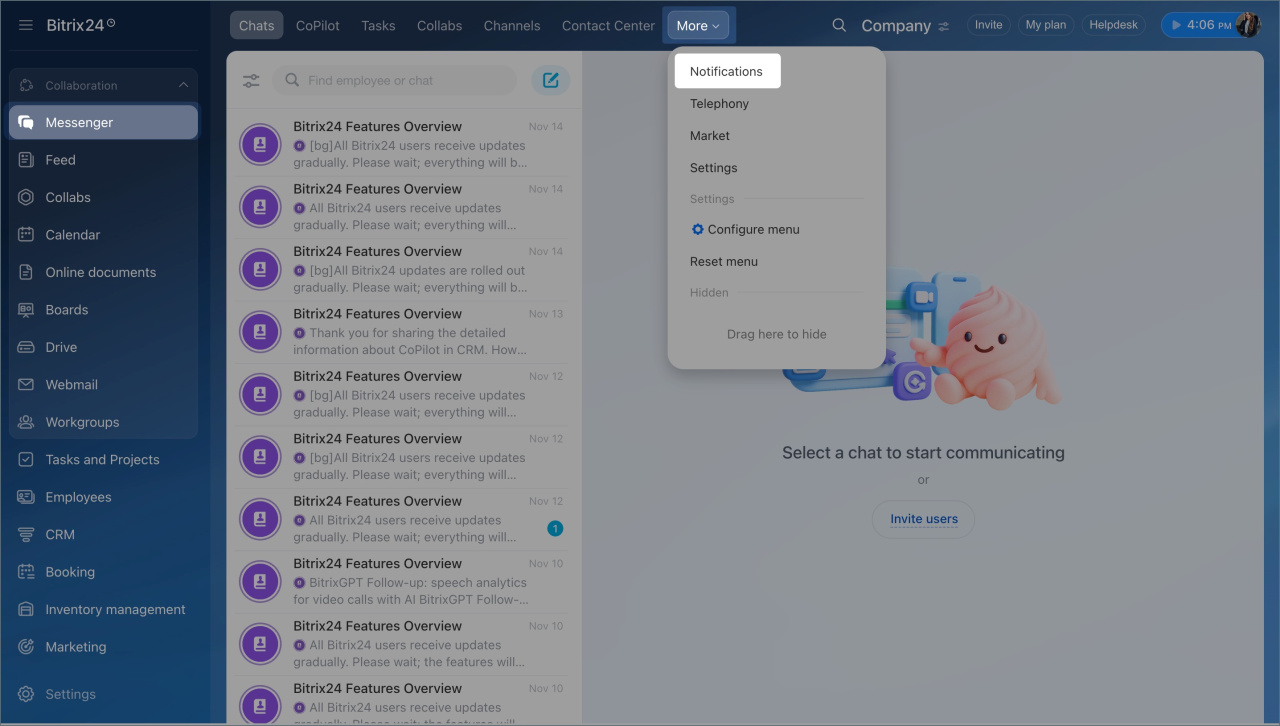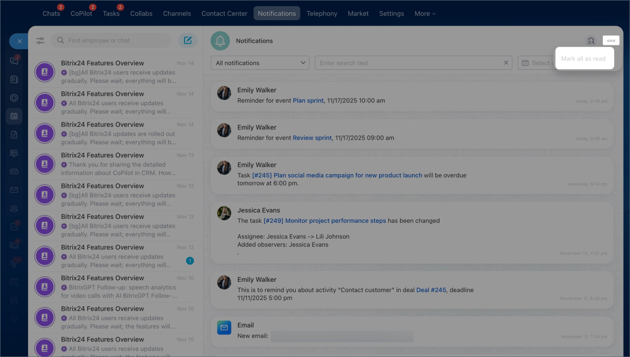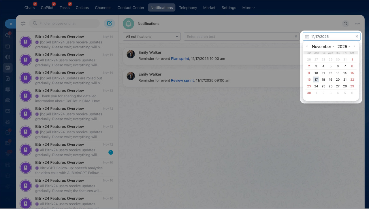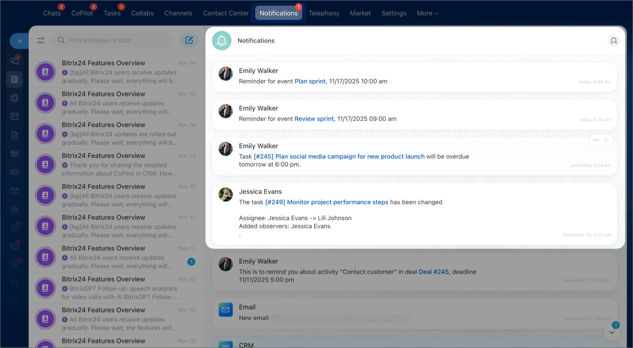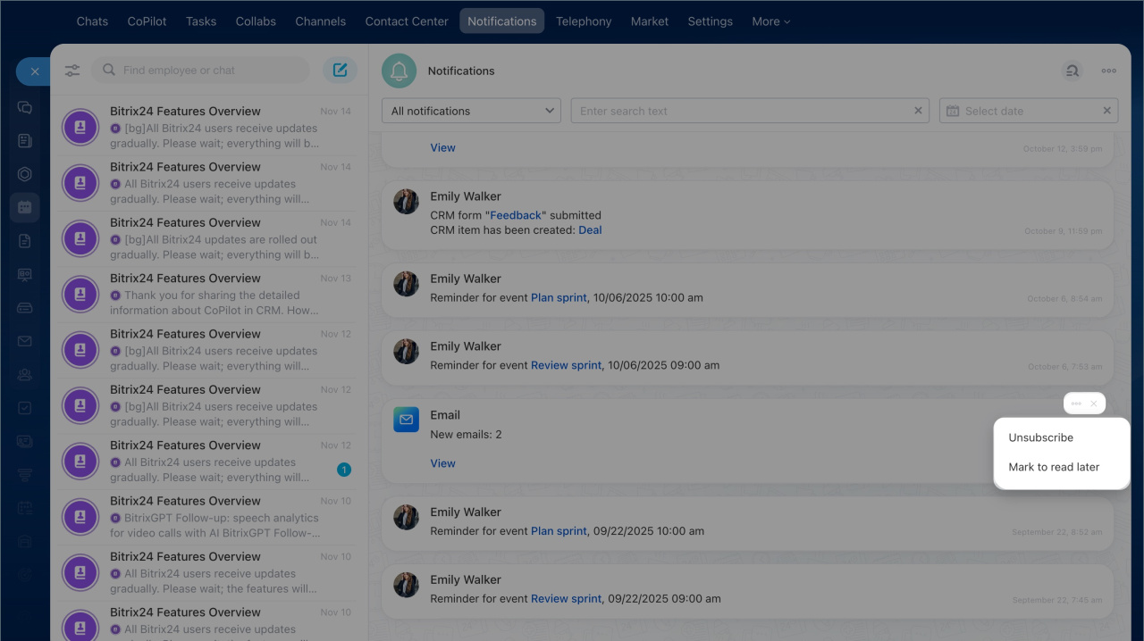 Les notifications dans Bitrix24 vous aident à rester informé des événements importants tels que les nouvelles tâches, les commentaires, les réunions ou les mises à jour CRM. Leur gestion est désormais simplifiée grâce à une interface et une structure repensées, ainsi qu'à la possibilité de vous désabonner rapidement des notifications inutiles.