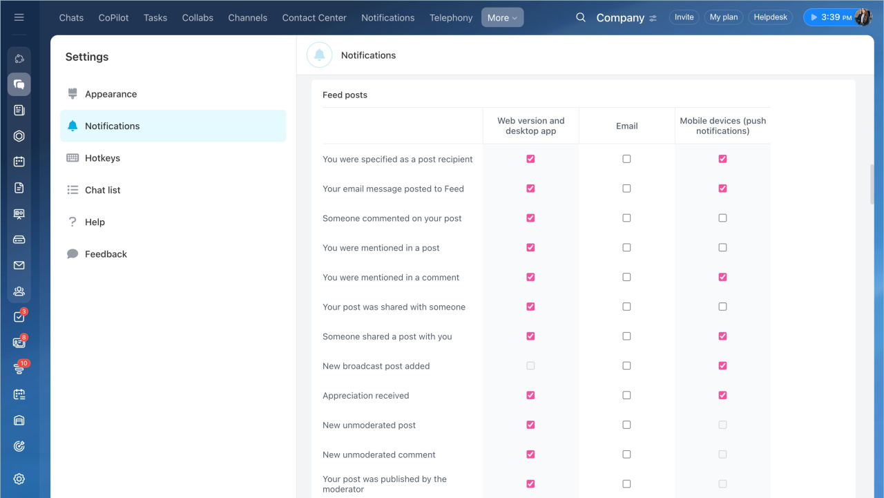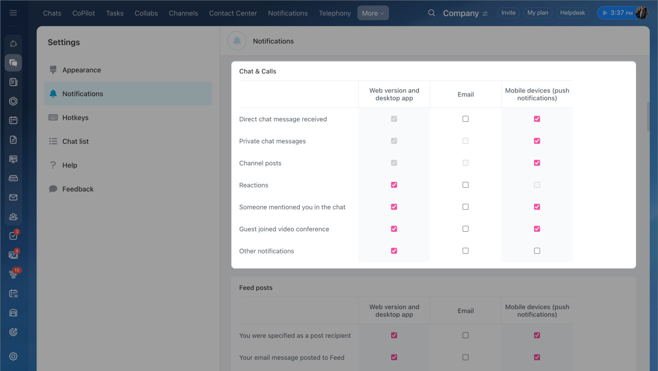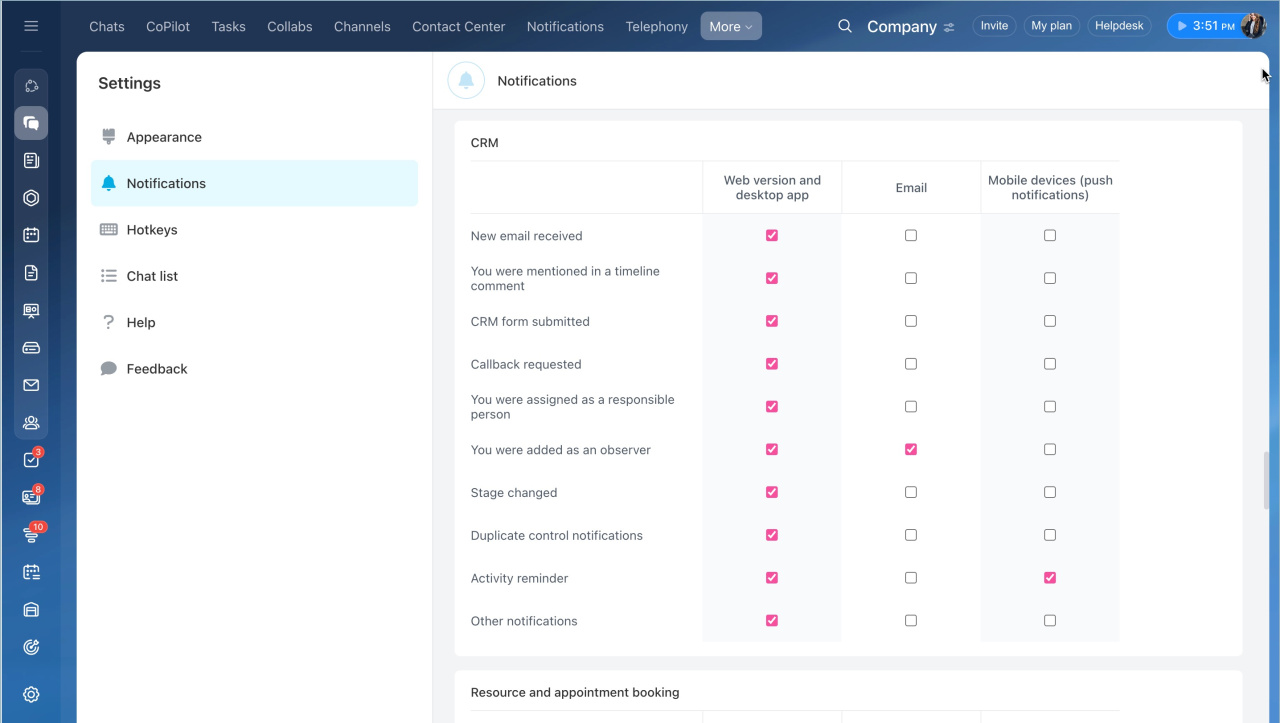 Vous pouvez personnaliser les notifications selon vos besoins en sélectionnant les événements à recevoir et les canaux où les consulter : dans le messenger, par e-mail ou via l'application mobile. Par exemple, vous pouvez activer les notifications CRM et désactiver les alertes liées aux tâches.