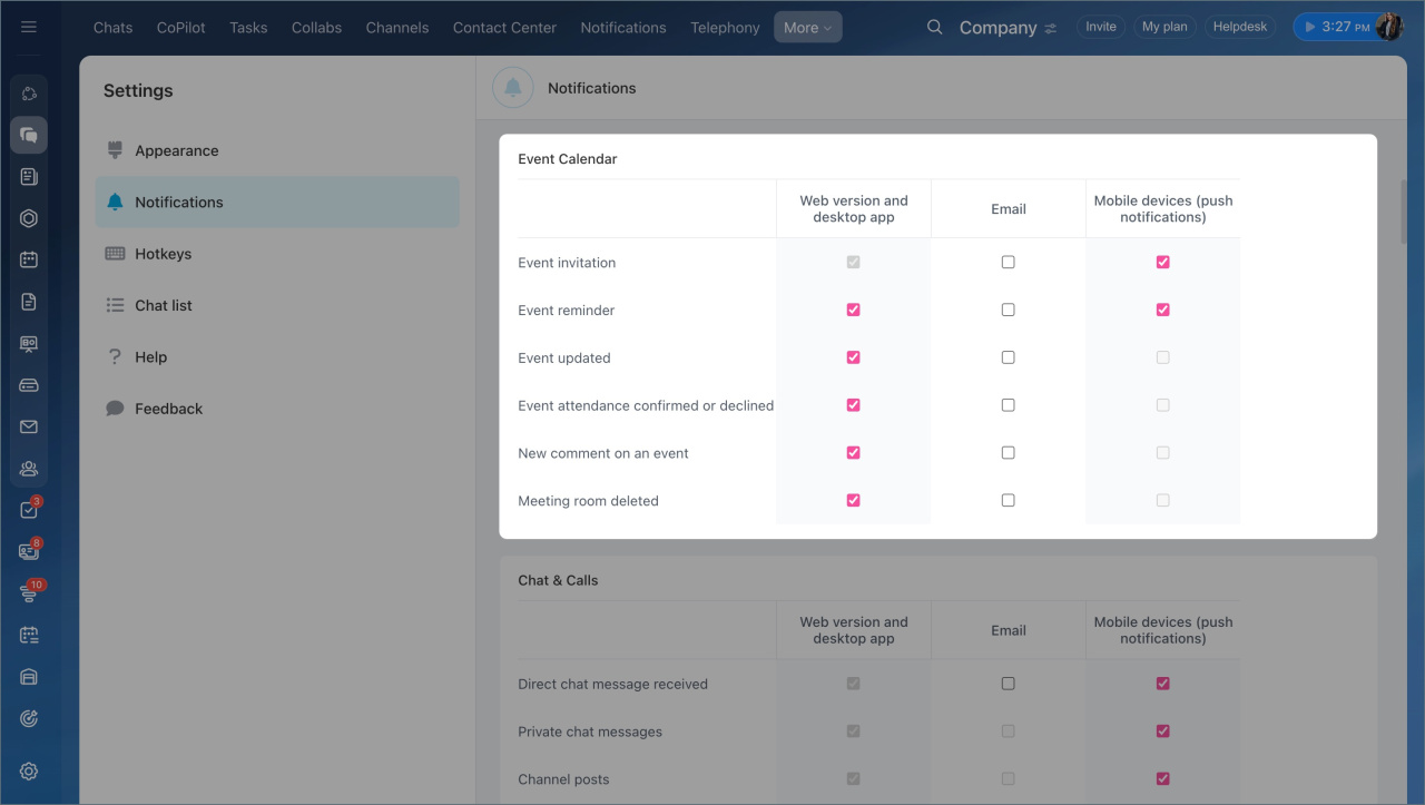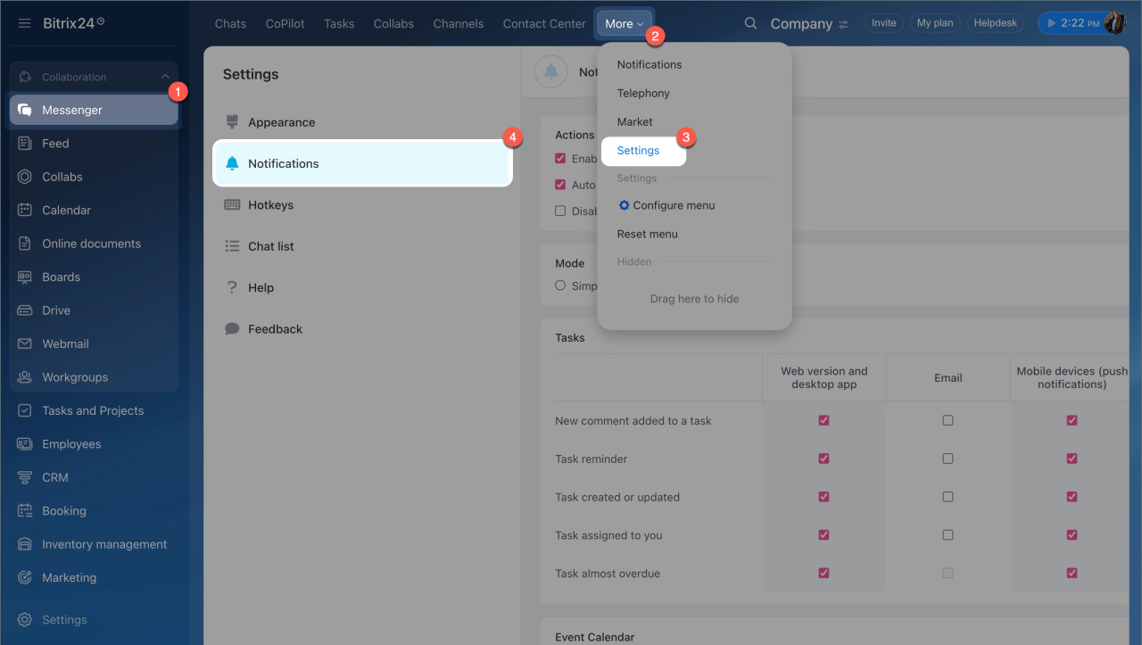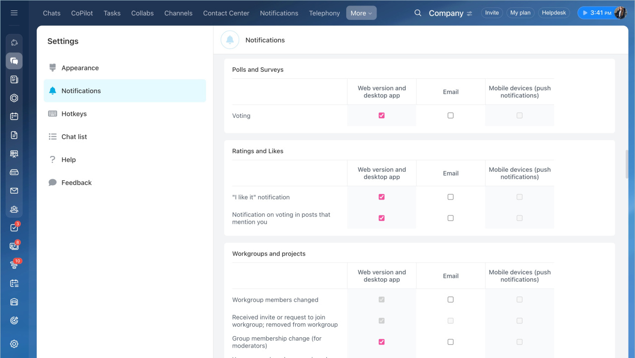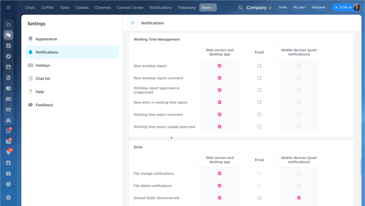 Vous pouvez personnaliser les notifications selon vos besoins en sélectionnant les événements à recevoir et les canaux où les consulter : dans le messenger, par e-mail ou via l'application mobile. Par exemple, vous pouvez activer les notifications CRM et désactiver les alertes liées aux tâches.