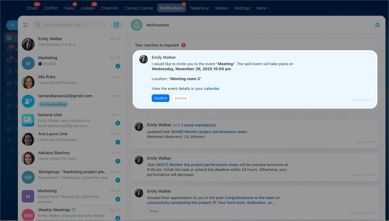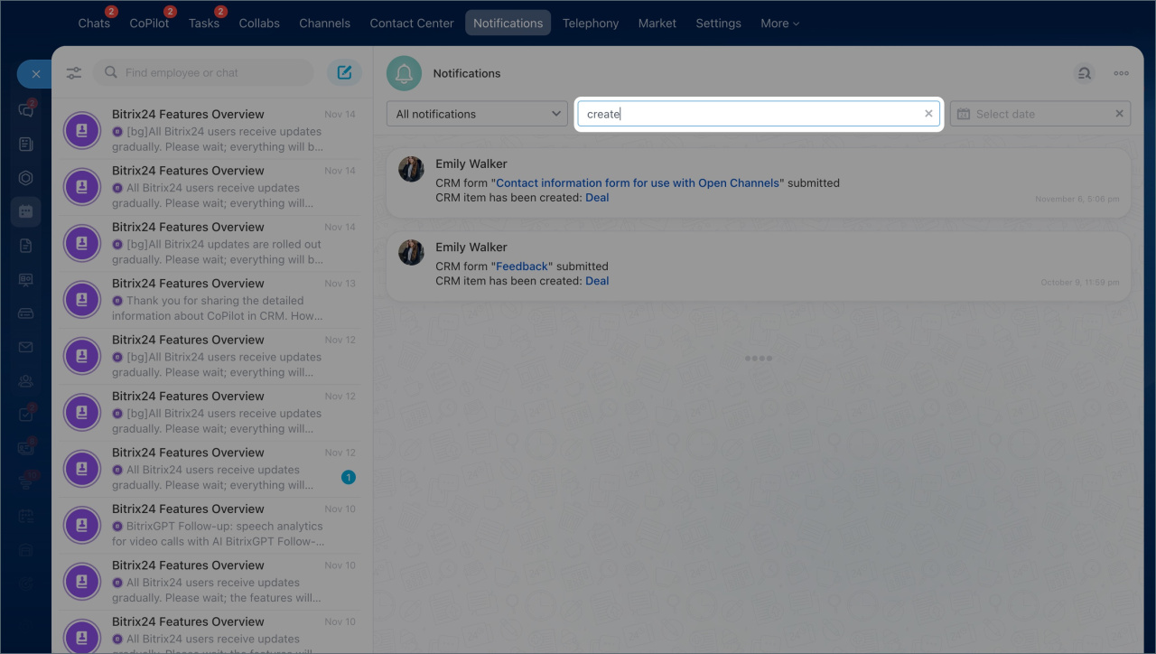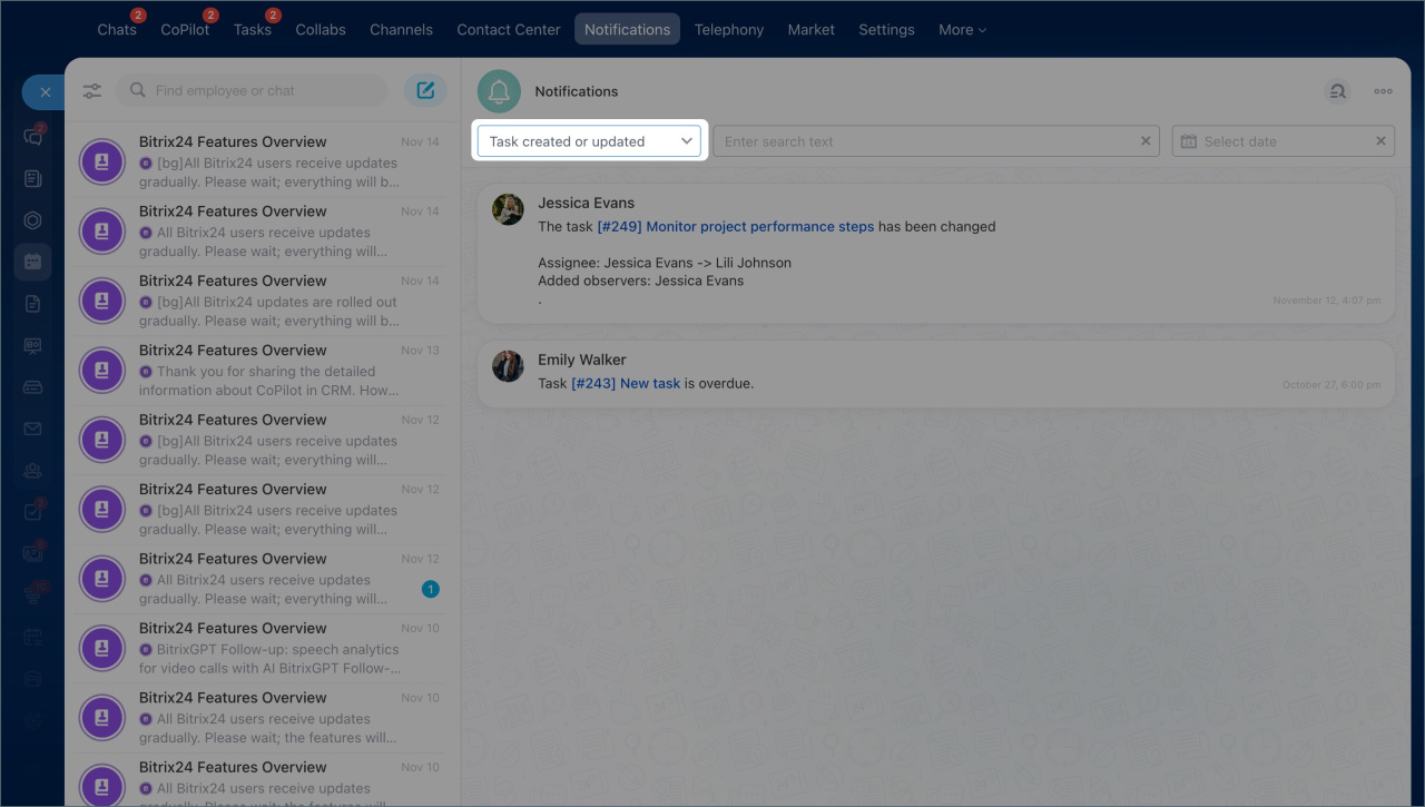 - Les notifications dans Bitrix24 vous informent des événements importants : nouvelles tâches, commentaires, réunions ou mises à jour du CRM.