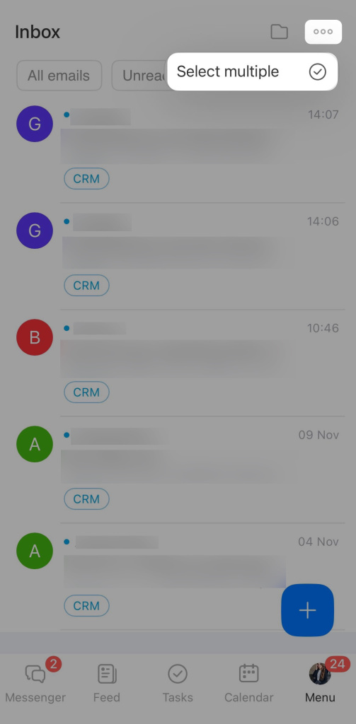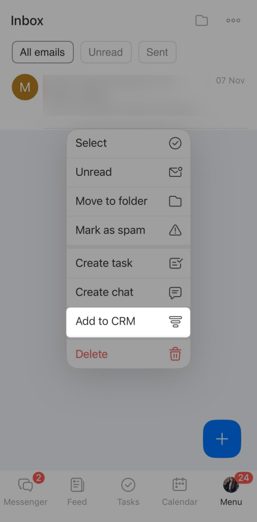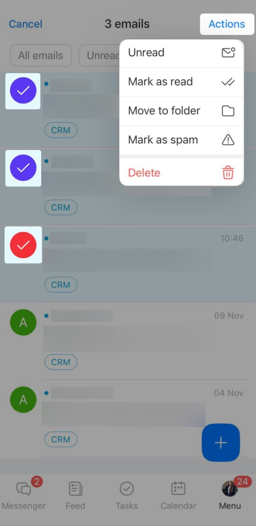 Pour exclure un e-mail du CRM, le marquer comme indésirable ou le supprimer - touchez Menu (...).
