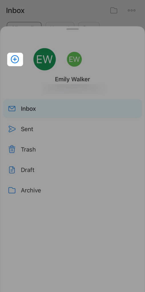 Pour connecter une autre boîte de réception - touchez l'icône de dossier et cliquez sur Plus (+).