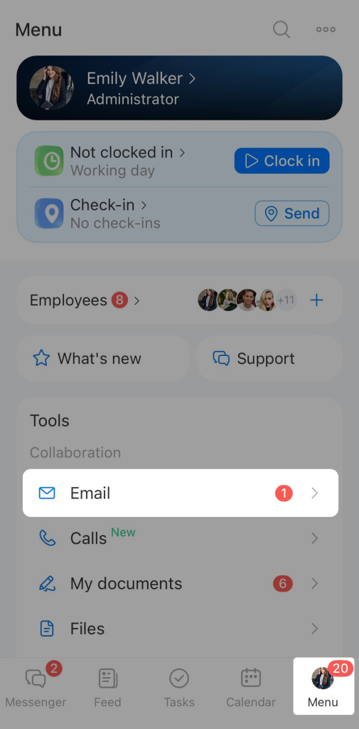 Dans l'application mobile Bitrix24, vous pouvez connecter votre messagerie et gérer vos e-mails comme sur un ordinateur. Lisez et envoyez des e-mails, transférez-les à vos collègues, créez des tâches, liez-les au CRM, et bien plus encore. Cela est particulièrement pratique si vous travaillez souvent en dehors du bureau et souhaitez répondre rapidement aux e-mails de clients, collègues ou partenaires.