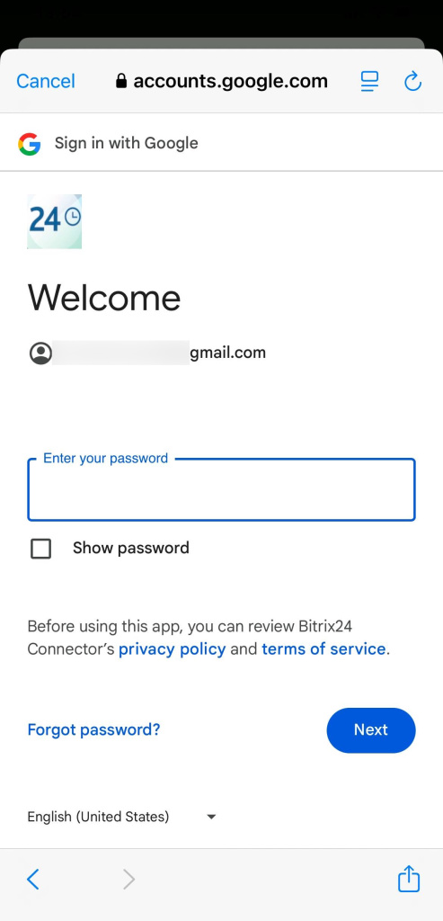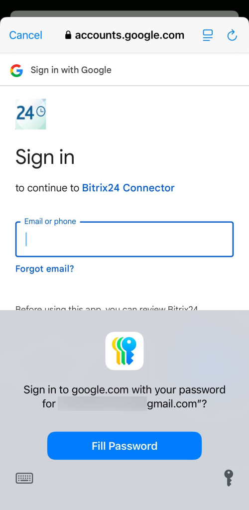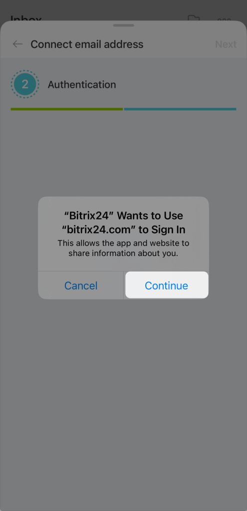 - Touchez Continuer, une fenêtre d'autorisation pour le service sélectionné s'ouvrira.
