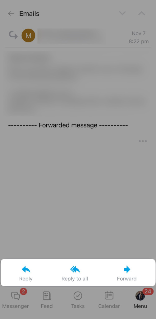 - Après avoir connecté votre messagerie dans l'application mobile, vous pouvez effectuer toutes les actions de base : lire, répondre, transférer, créer des tâches, des événements, des formulaires CRM, etc.