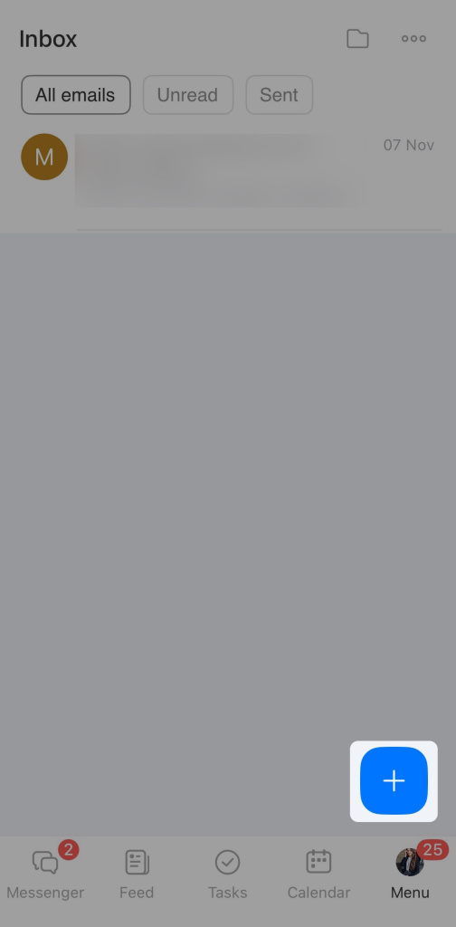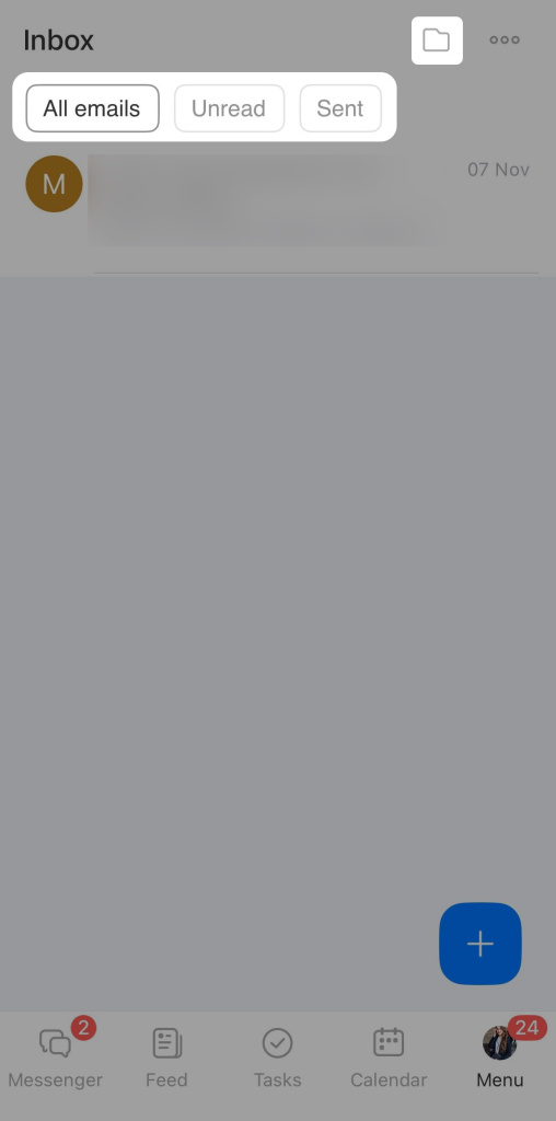 Après avoir connecté votre messagerie dans l'application mobile Bitrix24, vous pouvez effectuer toutes les actions de base avec vos e-mails.
