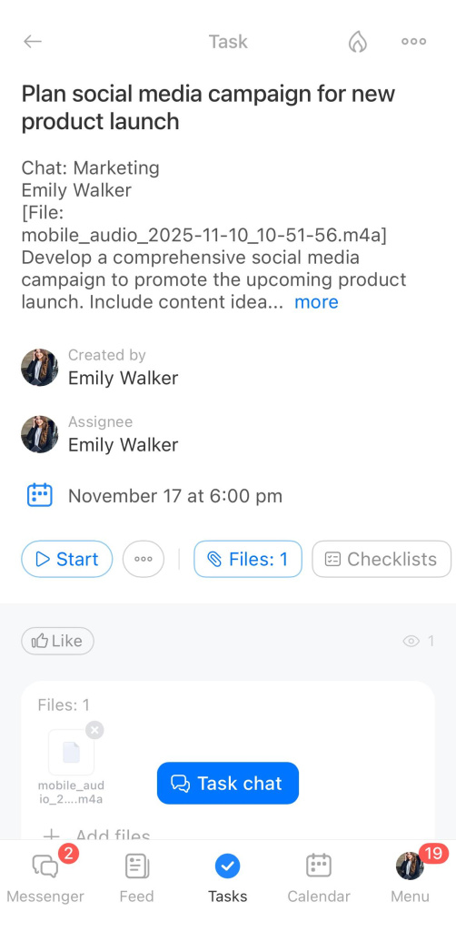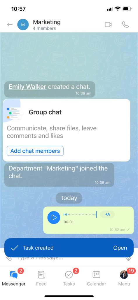- Après la création de la tâche, une notification apparaît dans la discussion. Vous pouvez ouvrir la tâche et configurer des éléments supplémentaires : participants, fichiers, etc.