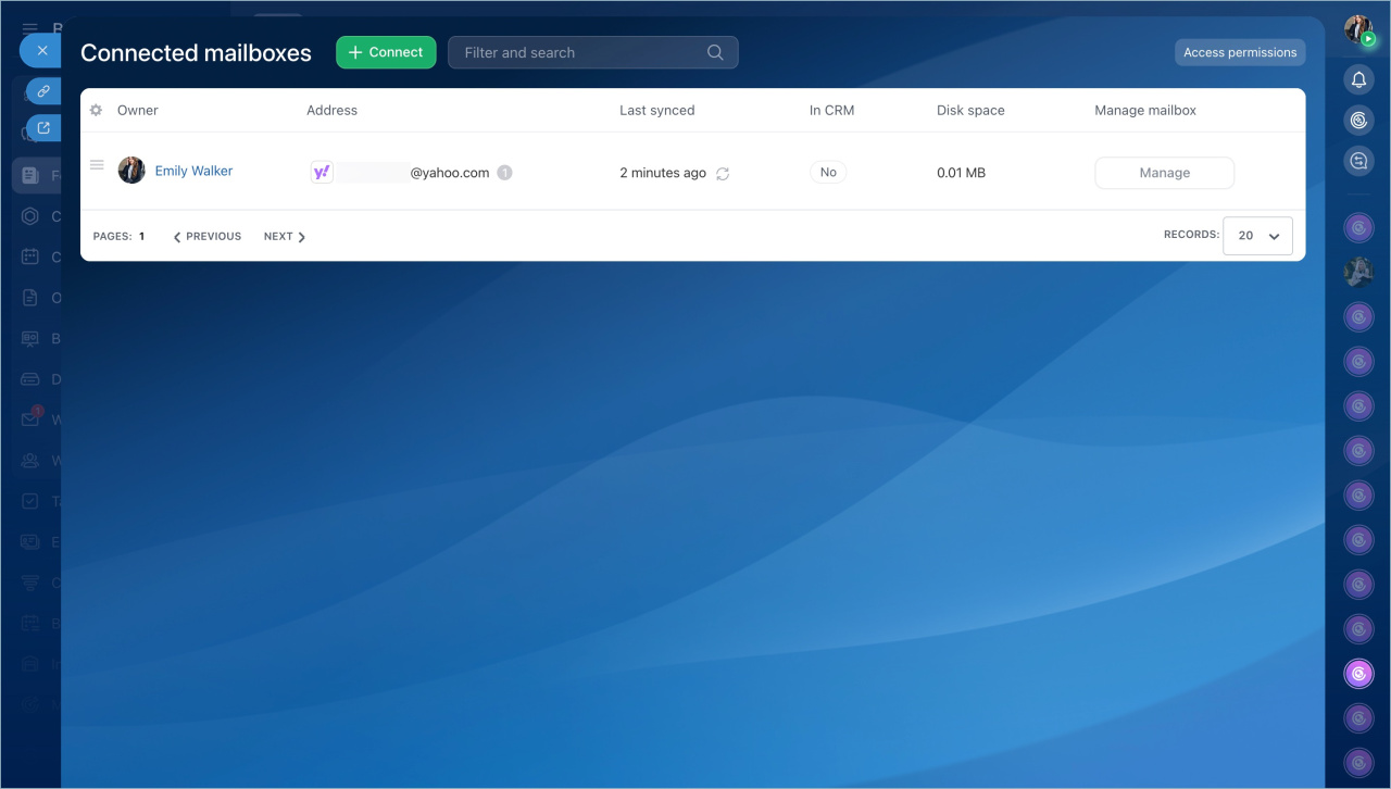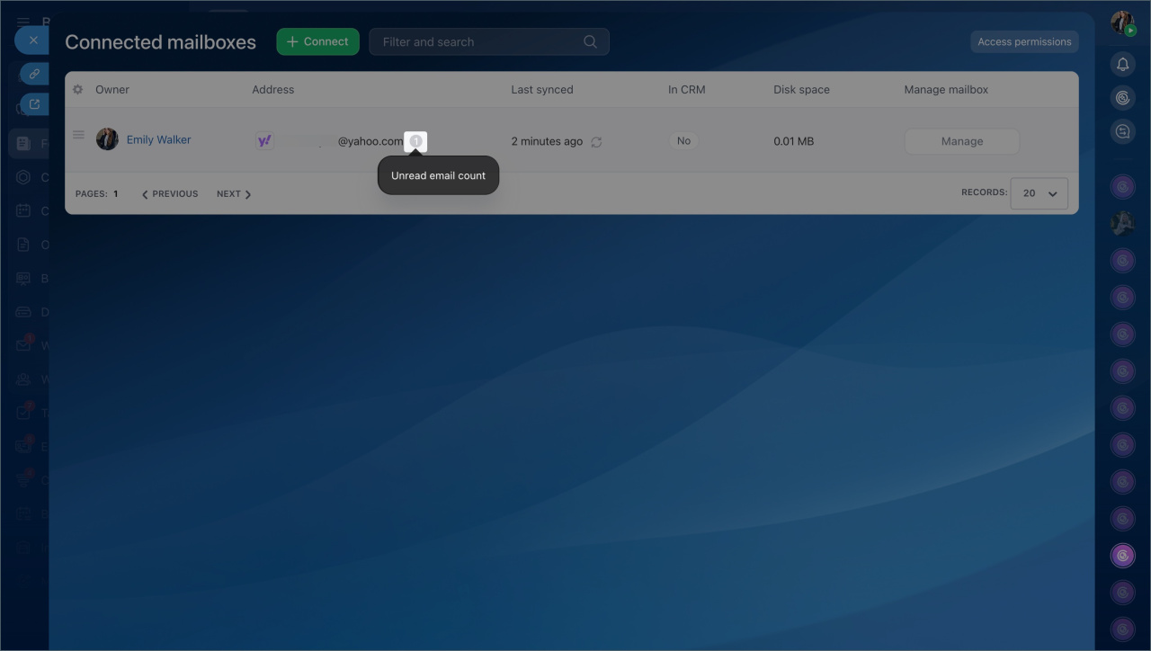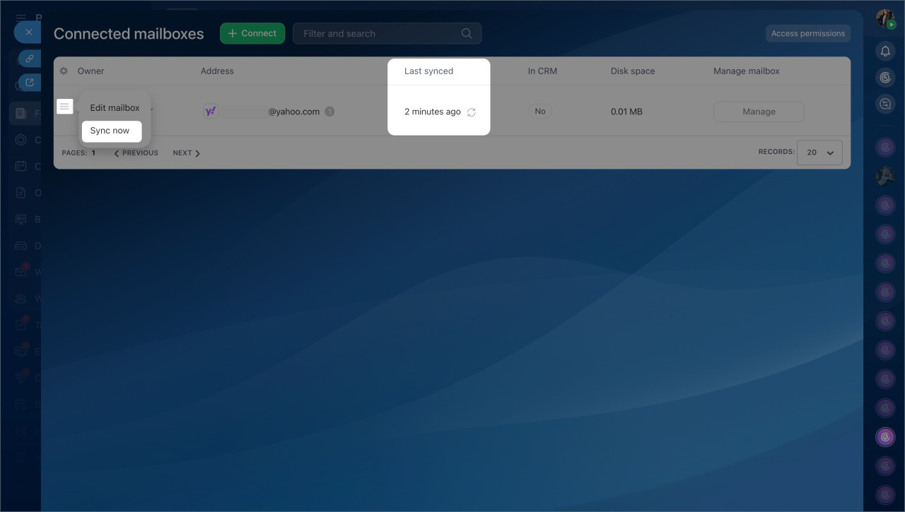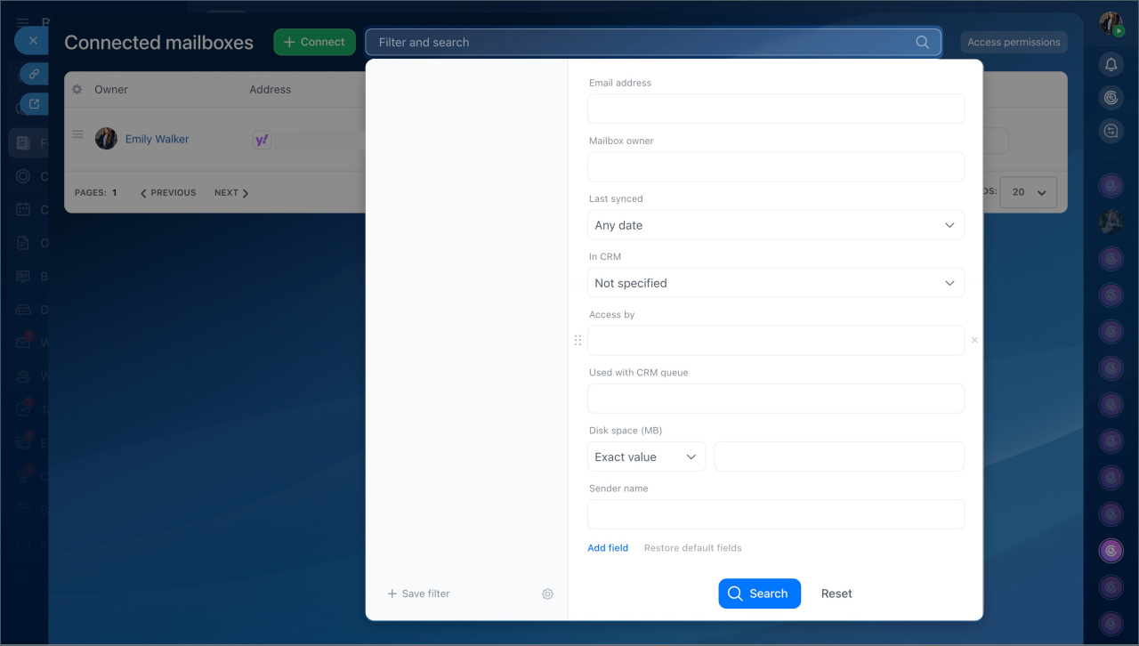Si l'entreprise dispose de nombreuses boîtes de réception connectées, la recherche manuelle peut être peu pratique. Les filtres permettent de trouver rapidement des données sans parcourir toute la liste. Par exemple, vous pouvez afficher uniquement les boîtes de réception intégrées au CRM ou celles qui n'ont pas été synchronisées depuis longtemps.