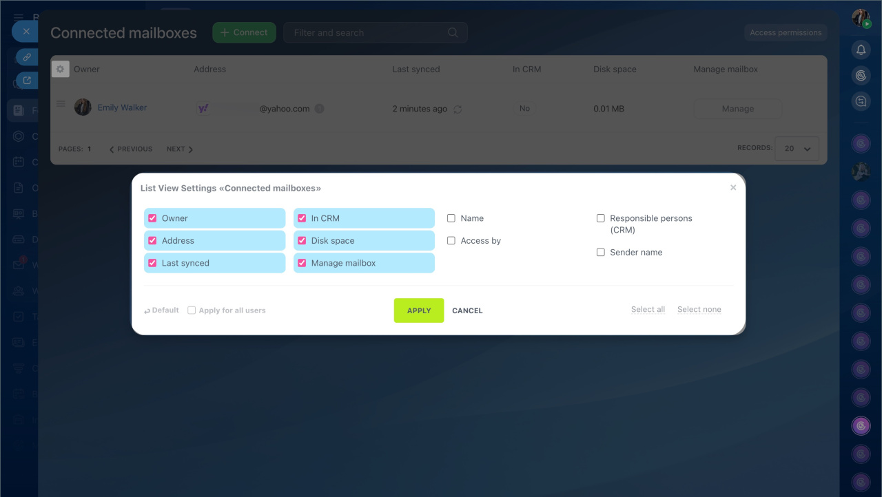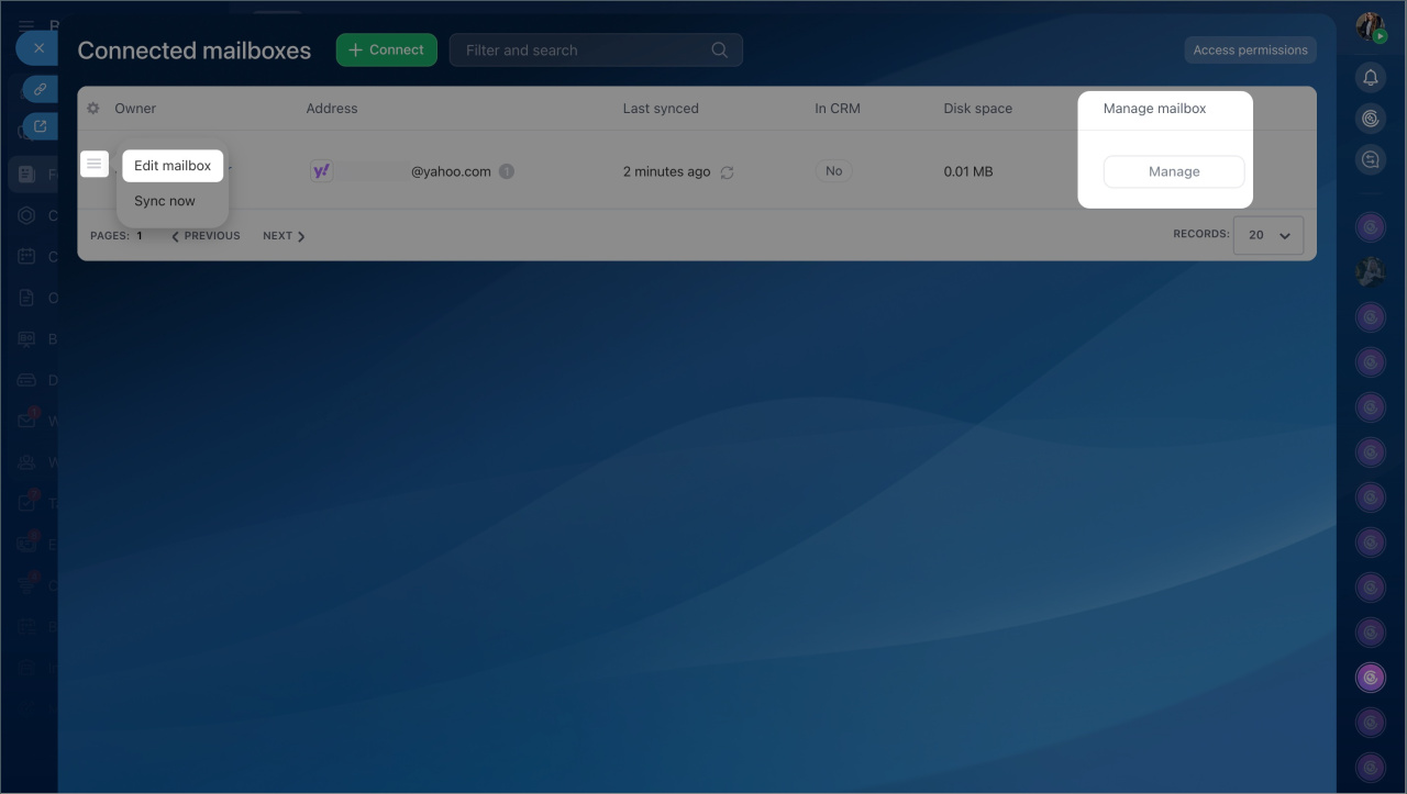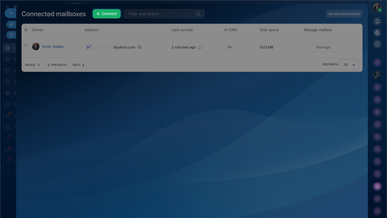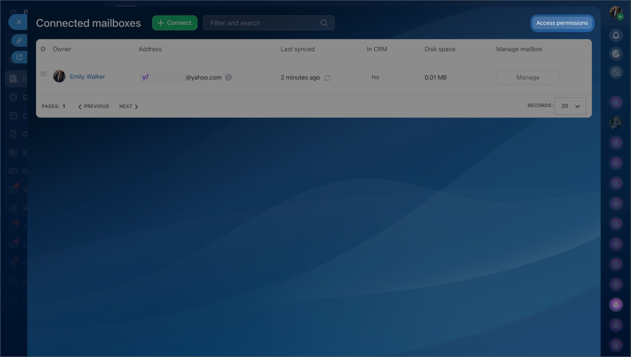 Si l'entreprise dispose de nombreuses boîtes de réception connectées, la recherche manuelle peut être peu pratique. Les filtres permettent de trouver rapidement des données sans parcourir toute la liste. Par exemple, vous pouvez afficher uniquement les boîtes de réception intégrées au CRM ou celles qui n'ont pas été synchronisées depuis longtemps.