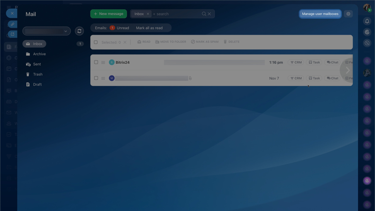 - Dans Bitrix24, vous pouvez gérer centralement les boîtes de réception des employés : consulter la liste des boîtes connectées, en ajouter de nouvelles, configurer les permissions d'accès, vérifier si une boîte est liée au CRM, et plus encore.