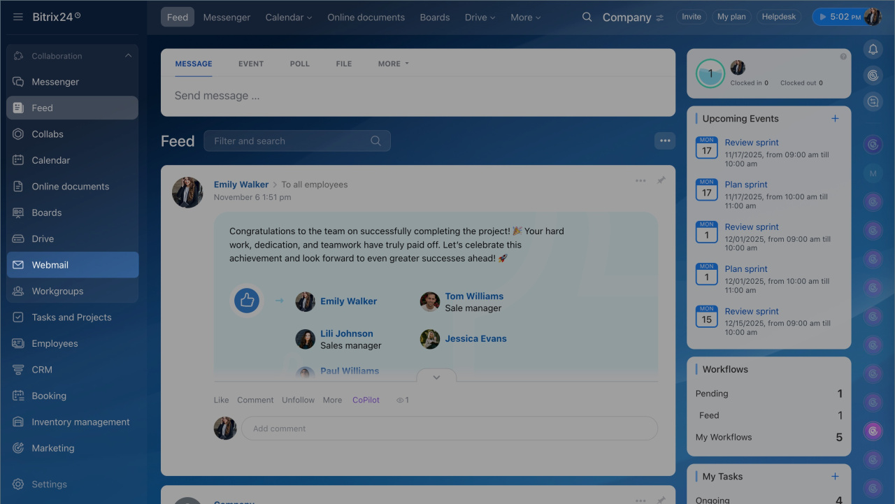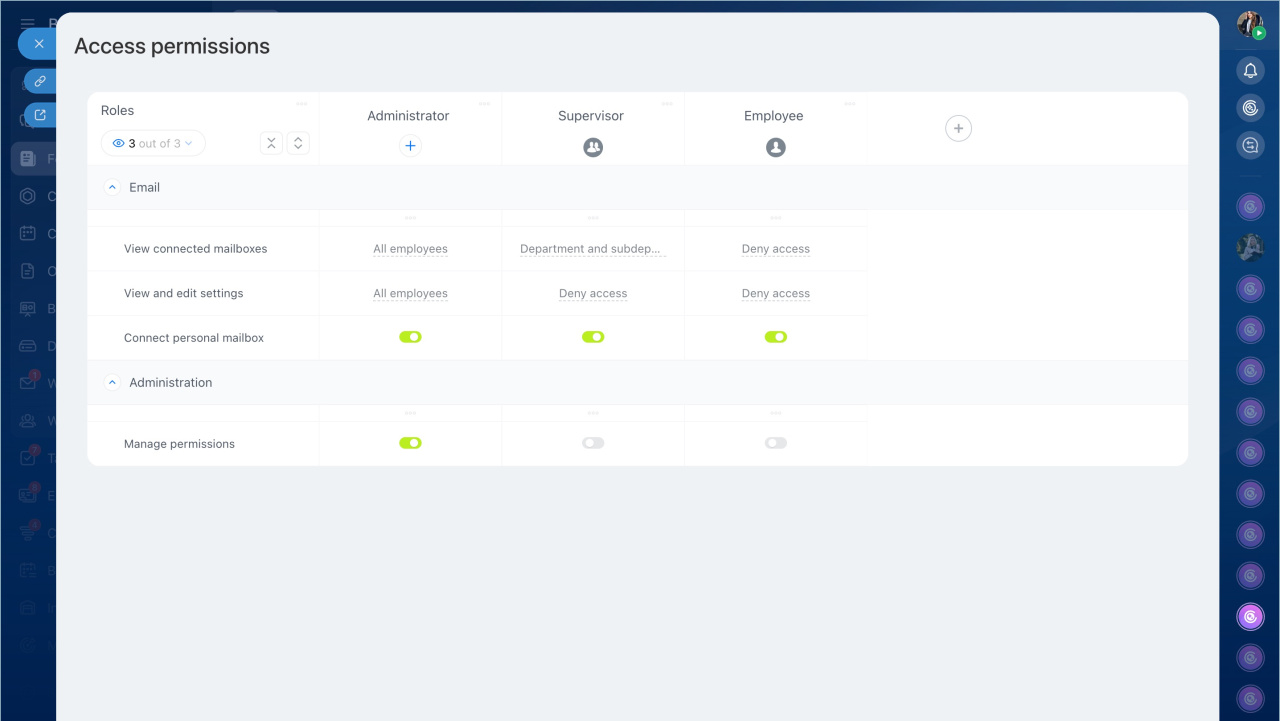 Dans Bitrix24, vous pouvez gérer centralement les boîtes de réception des employés : consulter la liste des boîtes connectées, en ajouter de nouvelles, configurer les permissions d'accès et vérifier si une boîte est liée au CRM.