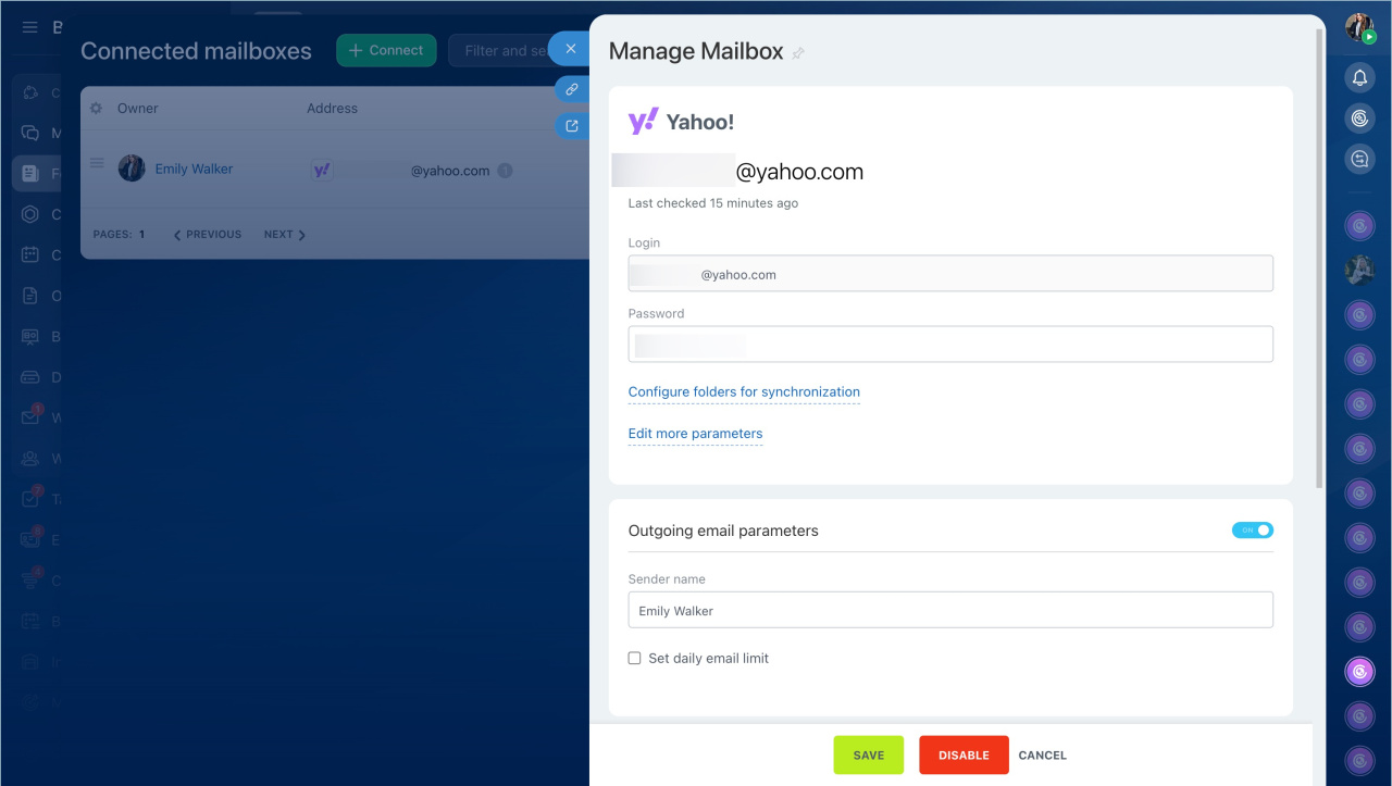 Modifier. Ajustez les paramètres de connexion, mettez à jour le mot de passe, changez le nom de l'expéditeur ou activez des paramètres supplémentaires comme l'intégration CRM.