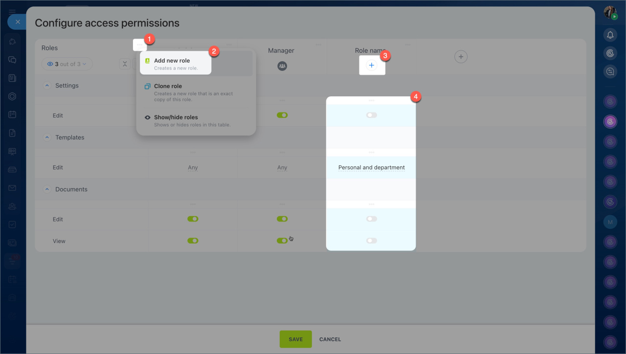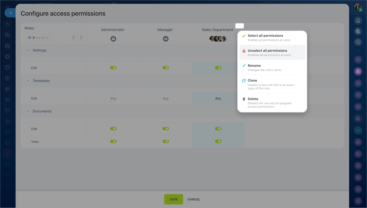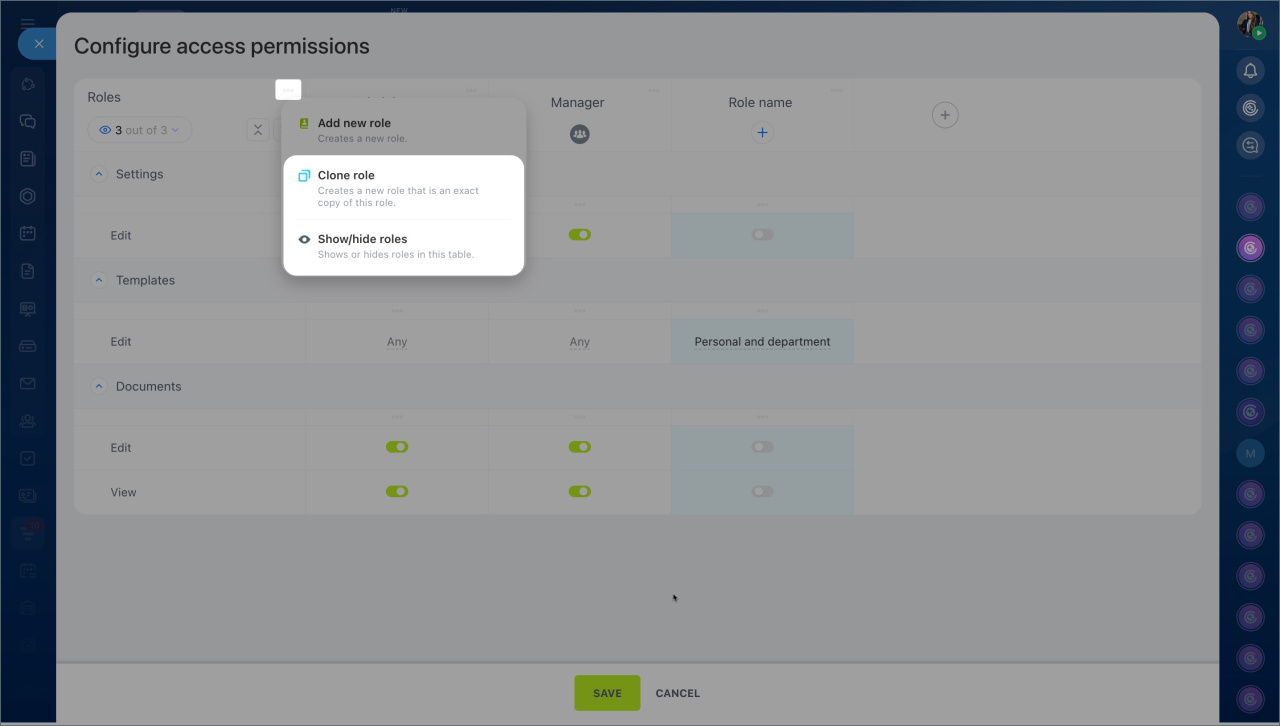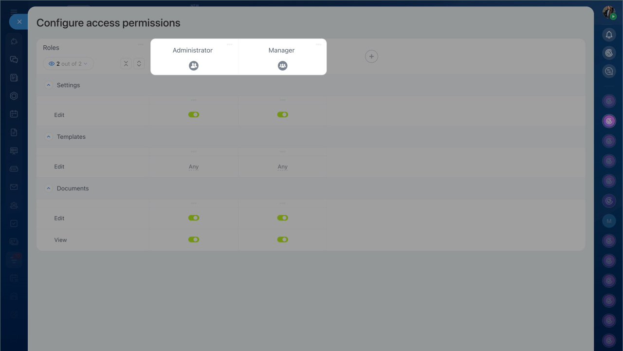 Un rôle est un ensemble de permissions d'accès attribuées à un utilisateur. Par défaut, deux rôles sont disponibles : Administrateur et Responsable. Leurs paramètres permettent aux employés de travailler avec tous les documents et de gérer les paramètres d'accès.