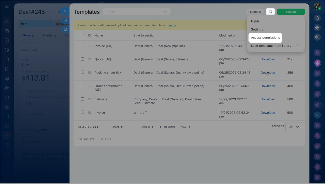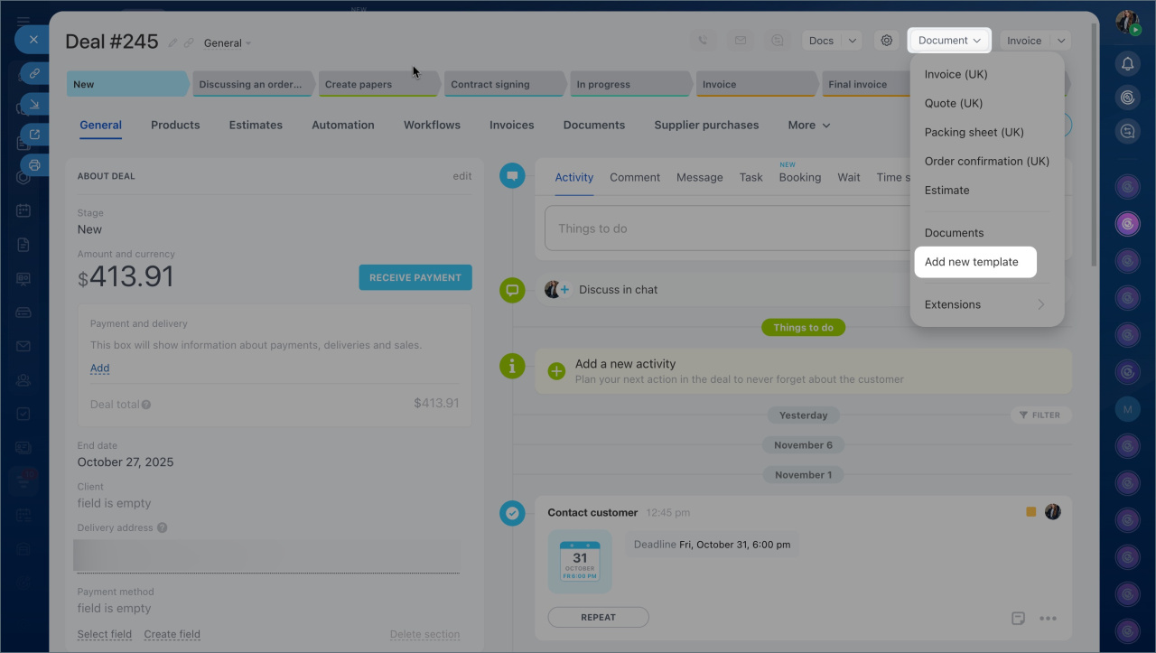 Dans Bitrix24, vous pouvez générer des factures, des actes, des bons de livraison et d'autres documents à partir des données des éléments CRM et de la gestion des stocks. Les permissions d'accès déterminent qui peut consulter, modifier les documents et éditer les modèles.
