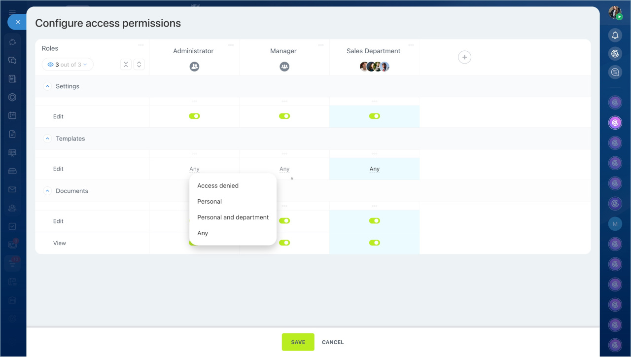 Paramètres. Cette permission permet de modifier les paramètres d'accès pour les documents et les modèles. Elle peut être accordée à un administrateur ou un superviseur pour configurer les rôles et accorder l'accès aux employés et départements. Par exemple, un chef de département peut activer l'accès aux modèles de documents pour son équipe.