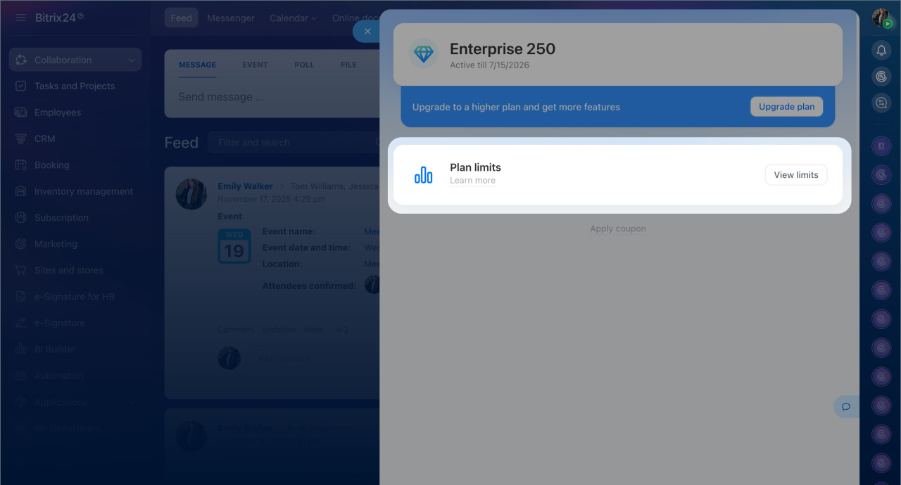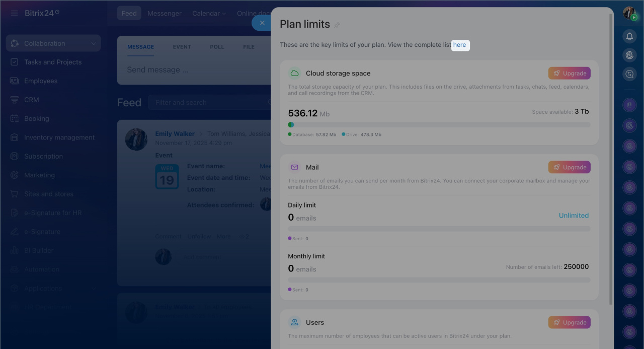 Messagerie dans Bitrix24 : caractéristiques de l'outil et possibilités de tarifs - Utilisateurs - précise le nombre d’employés et d’utilisateurs externes autorisés par votre plan, ainsi que le nombre d’utilisateurs enregistrés.