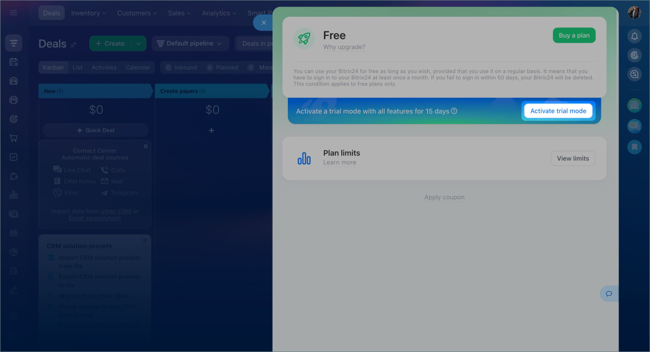 Mode d’essai. Activez 15 jours d’accès aux fonctionnalités du plan Professional pour découvrir les outils Bitrix24 avant d'acheter un abonnement.
