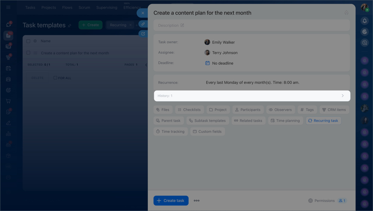 Par exemple, vous pouvez programmer la tâche « Envoyer les rapports » pour qu’elle soit créée le 25 de chaque mois pour un comptable, ou « Vérifier les campagnes publicitaires » chaque vendredi pour un responsable marketing. Ainsi, rien n’est oublié et les processus importants sont respectés.