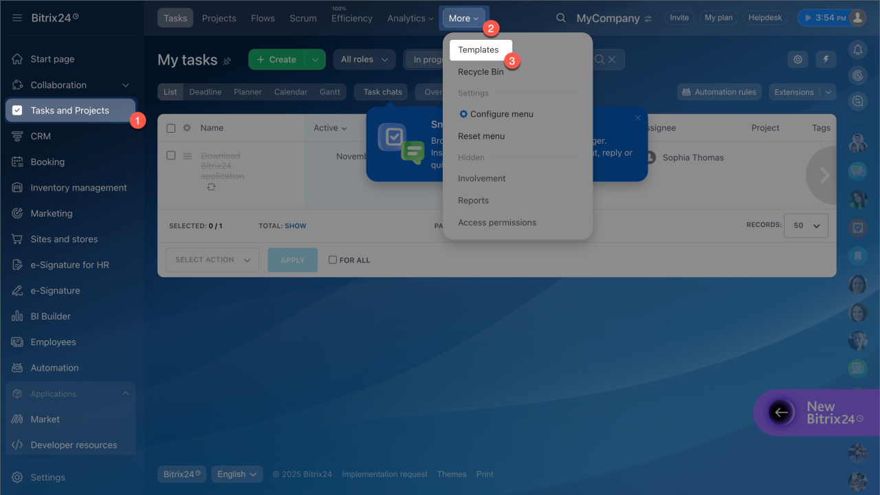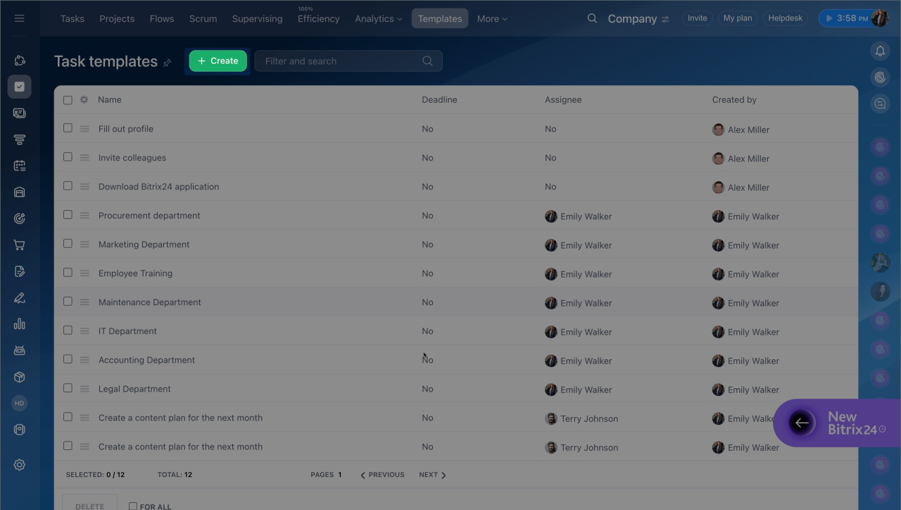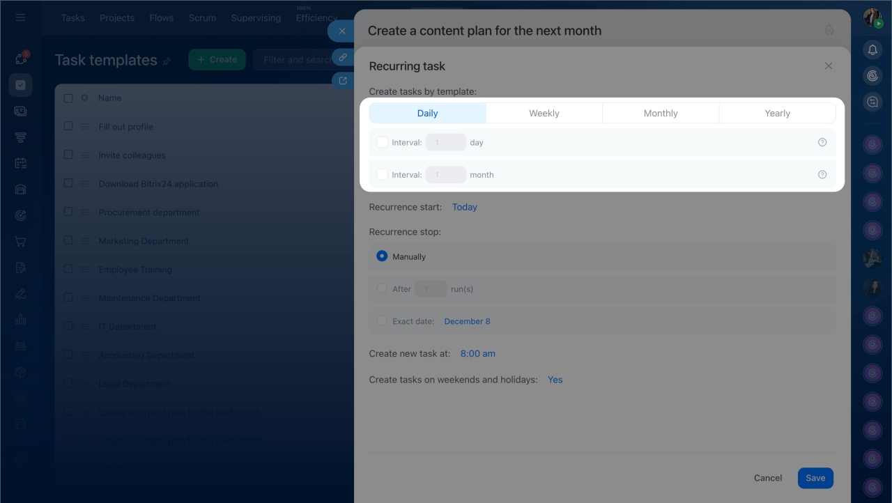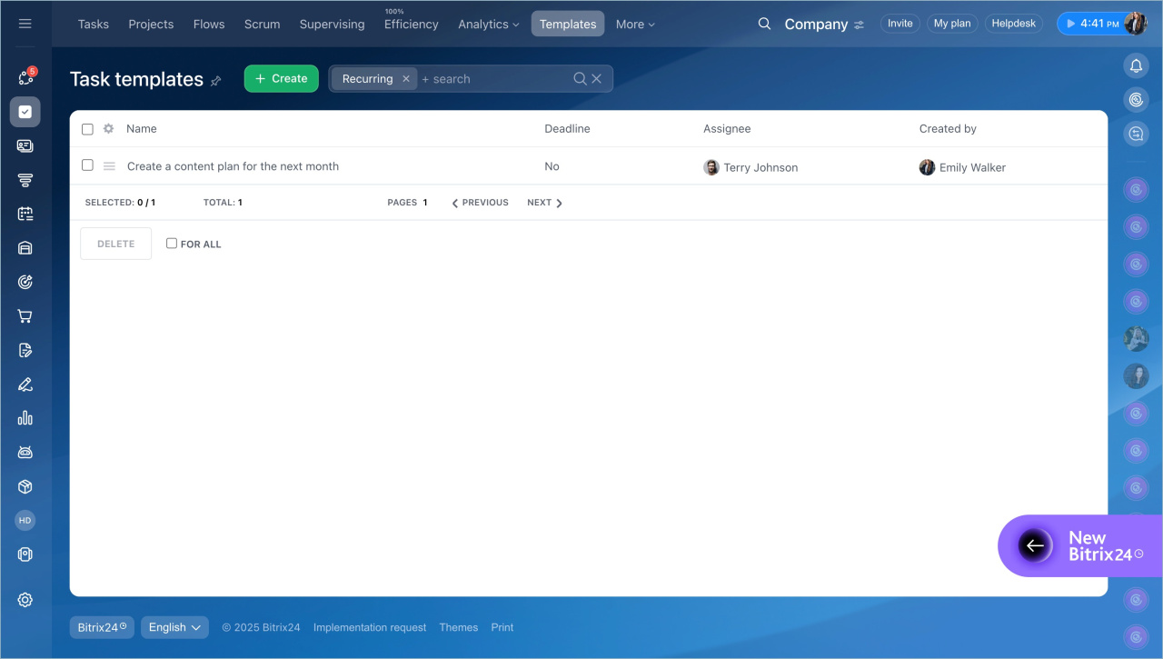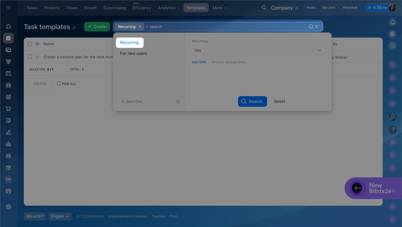- Elles reposent sur un modèle : vous définissez les paramètres une seule fois, puis Bitrix24 génère les nouvelles tâches automatiquement.