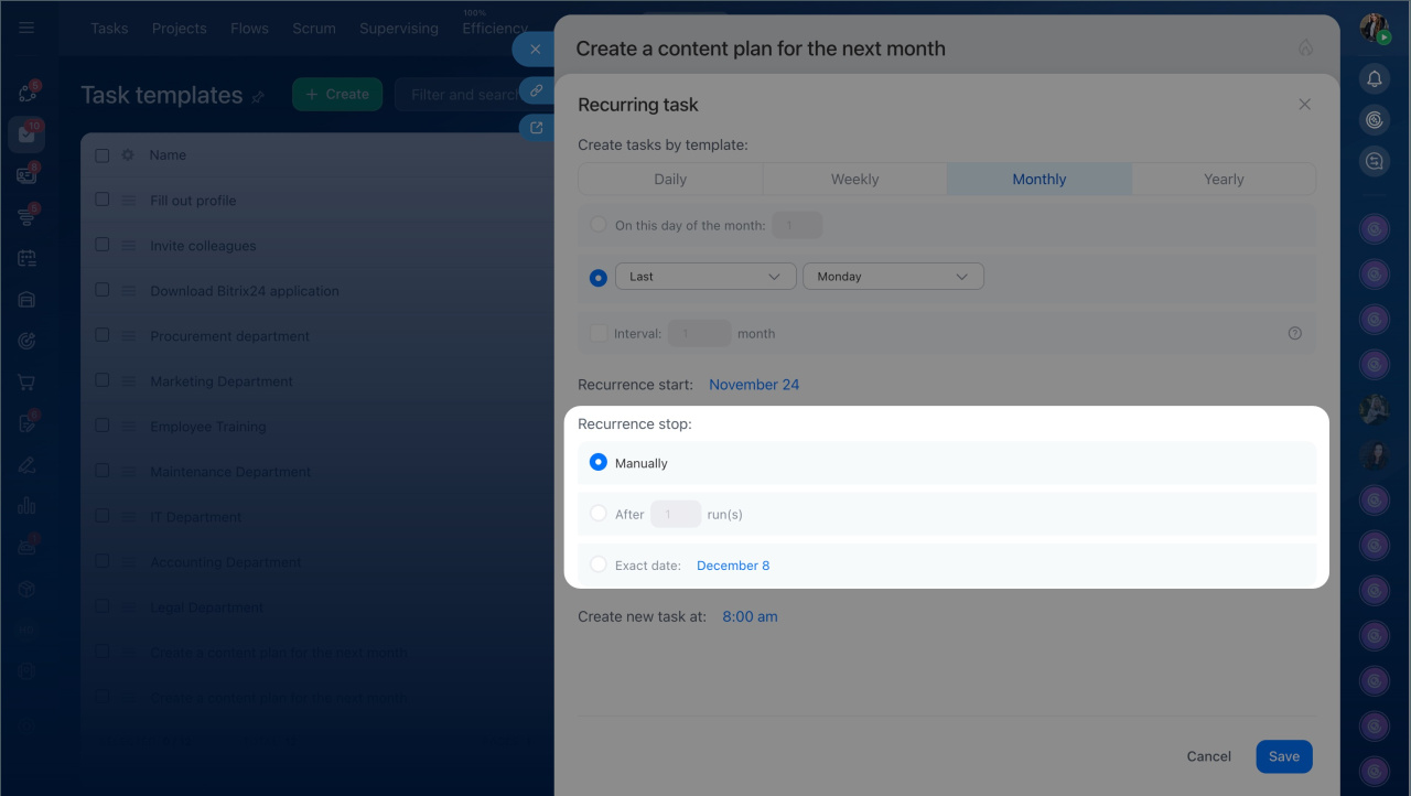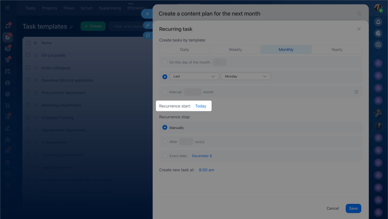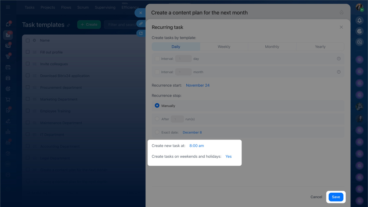 Choisissez l'heure de création des nouvelles tâches. Indiquez à quel moment les tâches doivent être générées. Par défaut, elles sont créées au début de la journée de travail, selon les paramètres de votre Bitrix24. Cette option vous permet de sélectionner un horaire adapté, lorsque les collaborateurs sont disponibles.