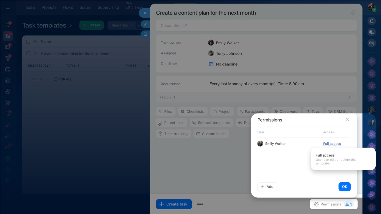 Les paramètres d’une tâche récurrente peuvent être modifiés par le créateur du modèle, un administrateur Bitrix24 ou un collaborateur disposant du droit Accès complet dans les paramètres du modèle.