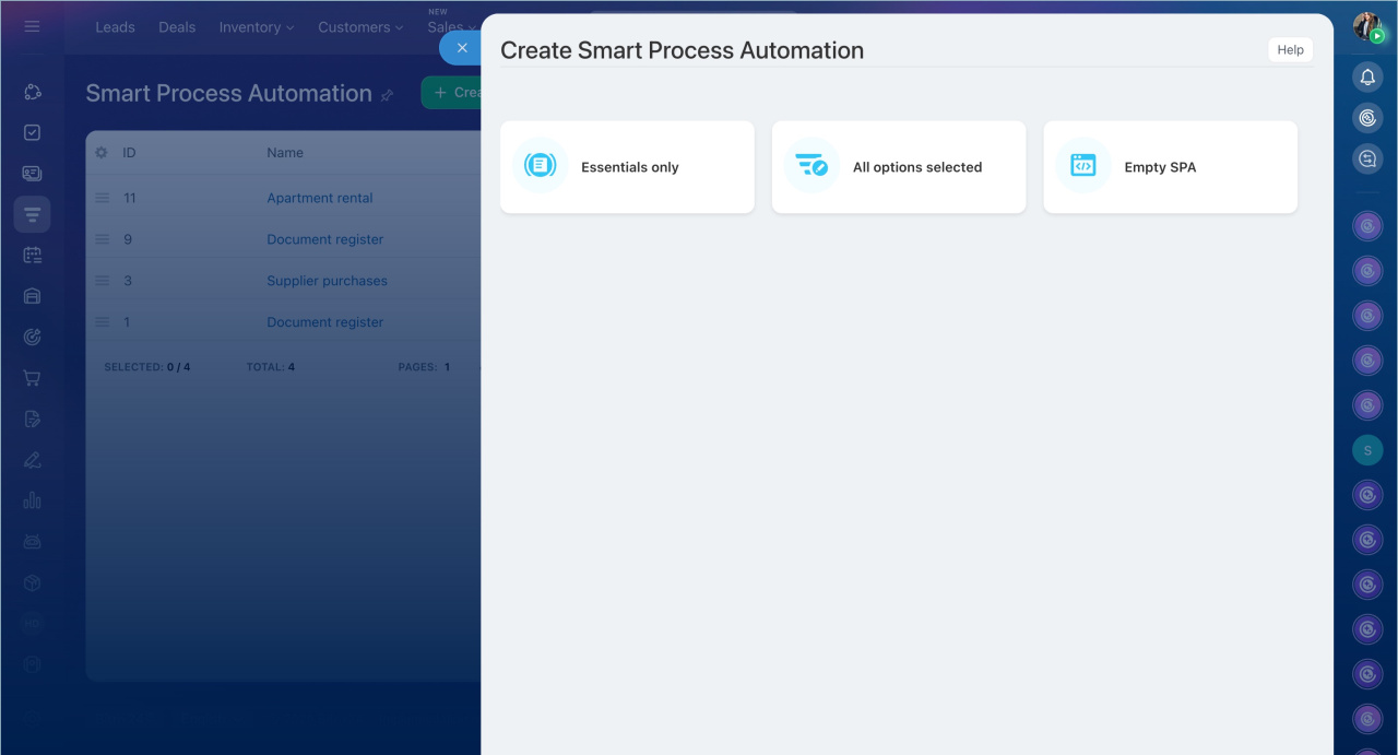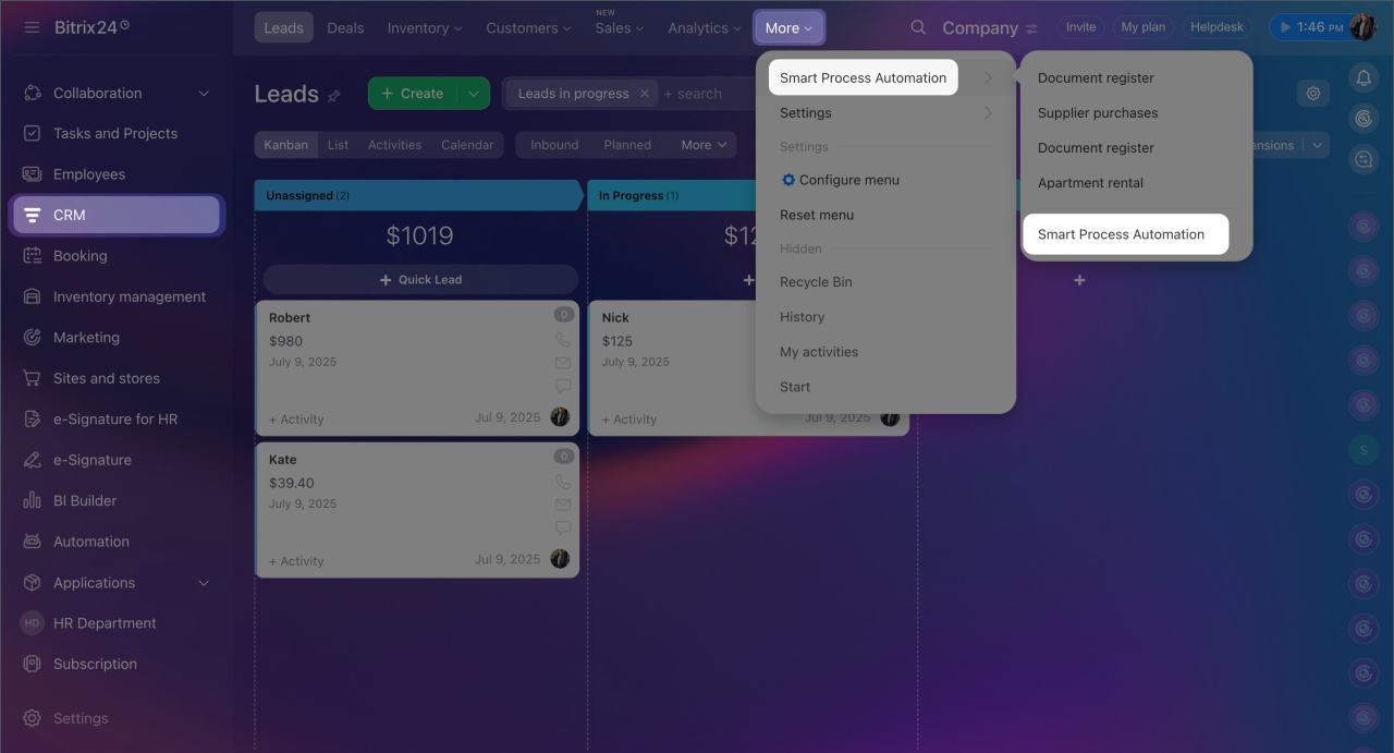 Les éléments récurrents des processus intelligents permettent de planifier automatiquement les actions régulières, que ce soit en interne ou dans vos échanges avec les clients. Définissez une fréquence, et Bitrix24 crée les éléments au moment voulu, par exemple chaque mois pour un inventaire ou chaque trimestre pour une maintenance. Vous gagnez ainsi du temps et ne manquez aucune étape importante.