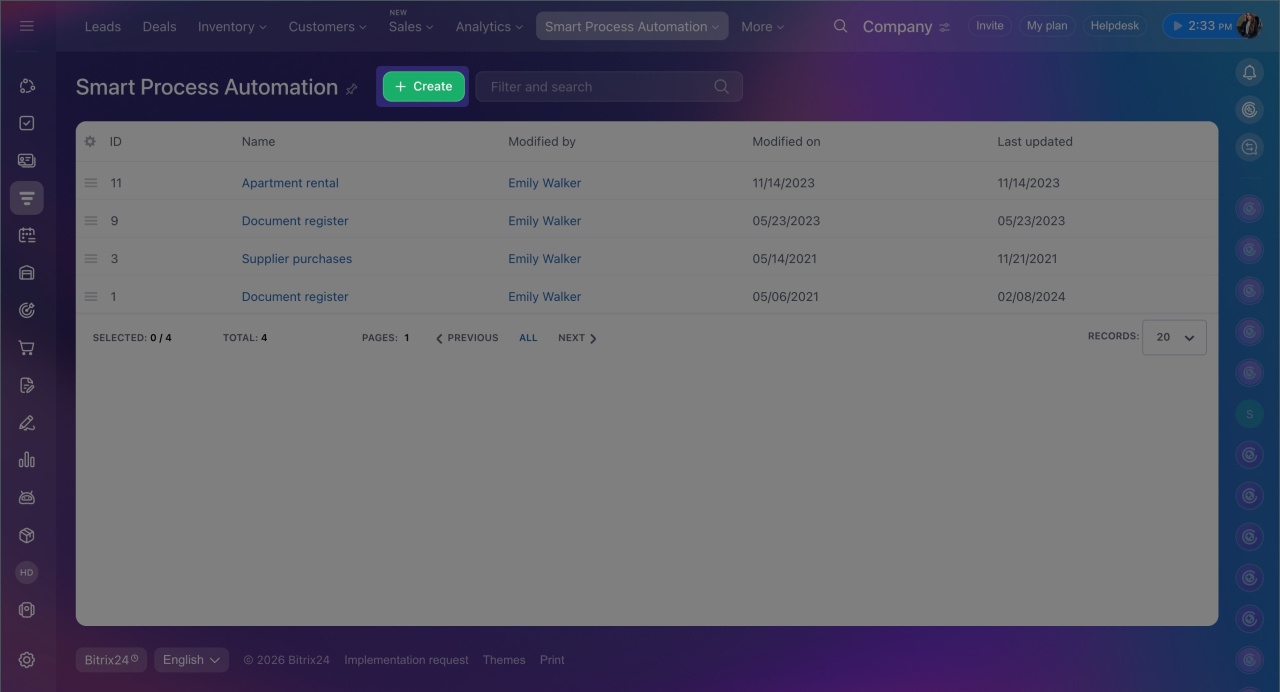 - Accédez à CRM > Plus > Processus intelligents > Processus intelligents et cliquez sur Créer.