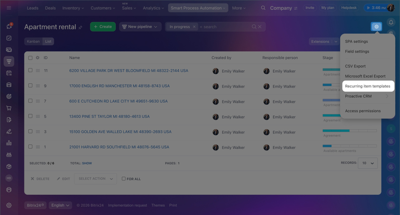 Lorsque vous créez un élément récurrent, Bitrix24 l’enregistre comme modèle. Les modèles sont regroupés dans une liste distincte pour chaque processus intelligent et chaque pipeline. Vous pouvez y consulter les informations principales, rechercher un modèle et le gérer.