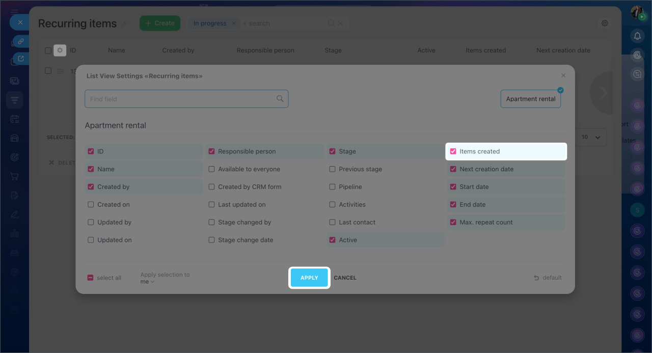 - Spécifier l'intervalle : le CRM crée automatiquement des éléments selon la fréquence choisie, par exemple chaque semaine ou chaque mois.