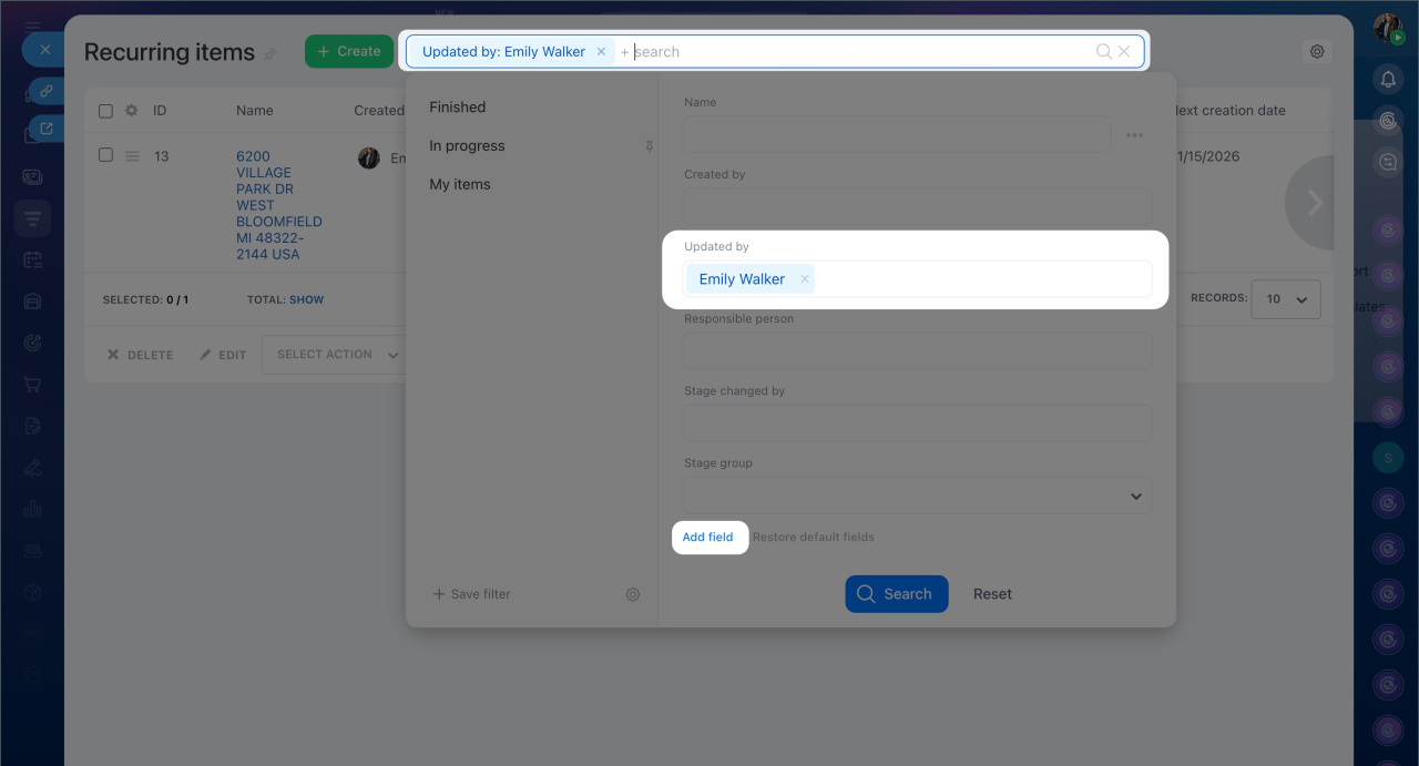 - Pour affiner la recherche, ajoutez des filtres. Cliquez de nouveau sur la barre de recherche et complétez les champs, par exemple le nom de l’élément ou celui de l’employé qui l’a mis à jour.