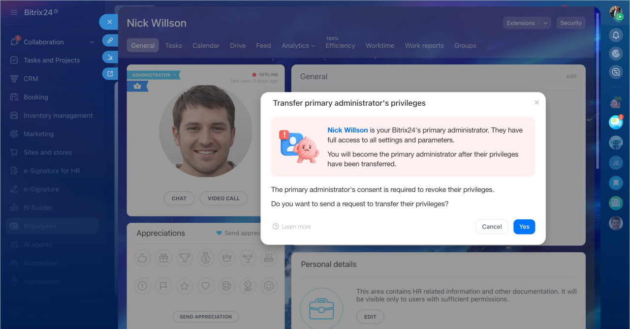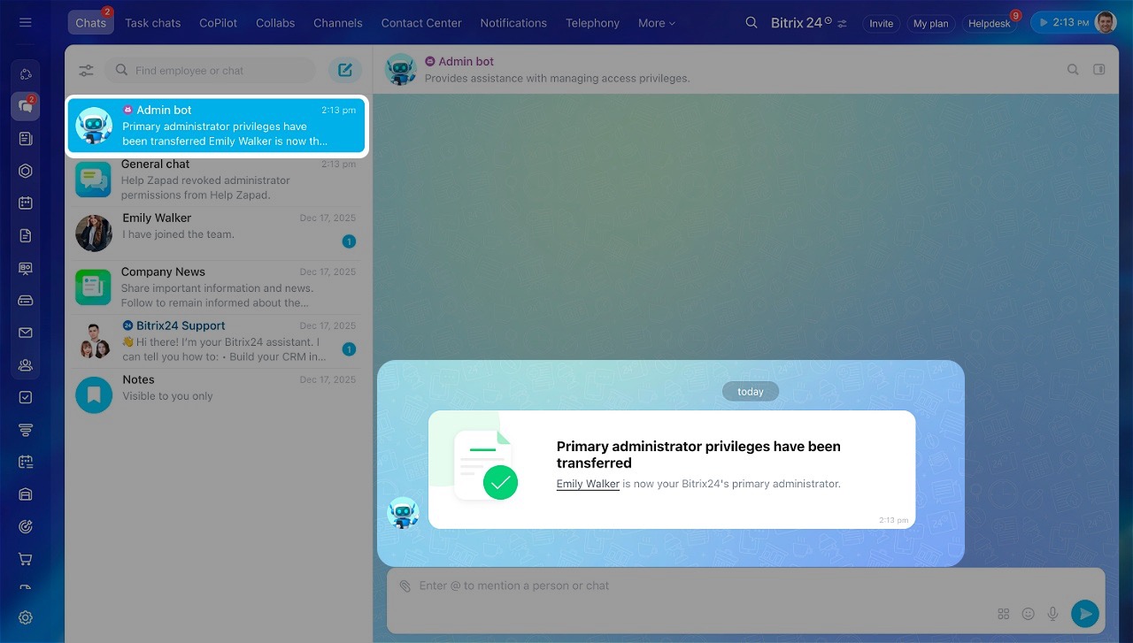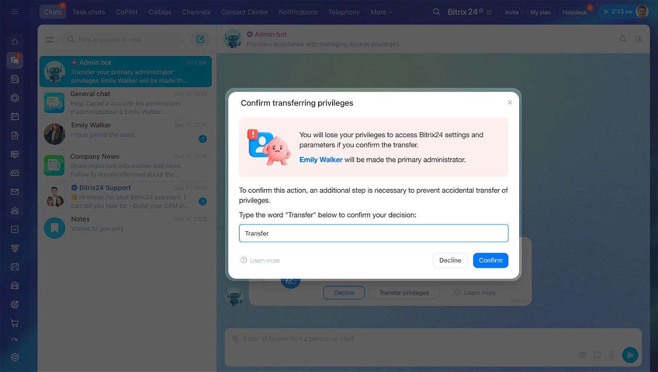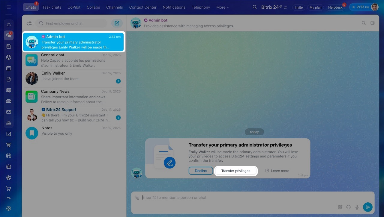 L’administrateur principal dispose des mêmes droits que les autres administrateurs, avec une différence importante : lui seul peut confirmer le transfert de ses droits ou son départ. Cela permet d’éviter tout changement accidentel ou non autorisé du propriétaire du compte Bitrix24.
