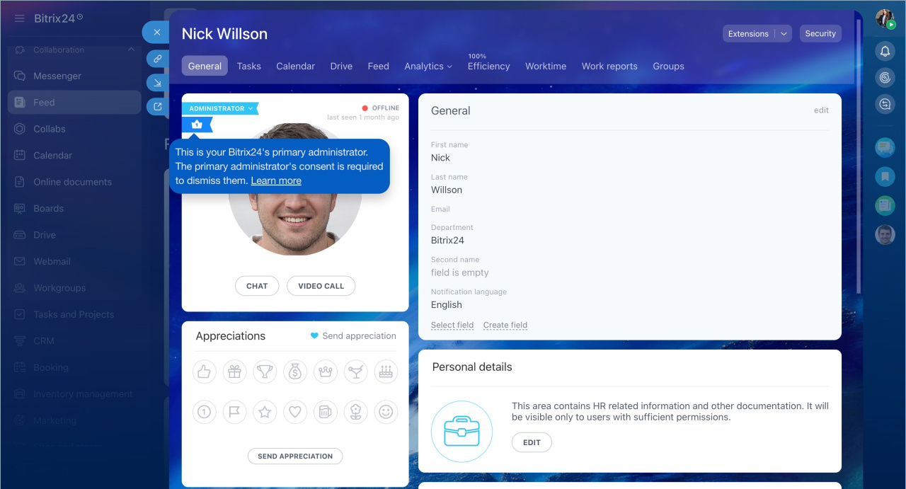 L’administrateur principal est l’utilisateur qui a créé votre compte Bitrix24. Il reçoit les notifications système par e-mail, telles que le renouvellement de l’abonnement, les actualités et les invitations aux webinaires.
