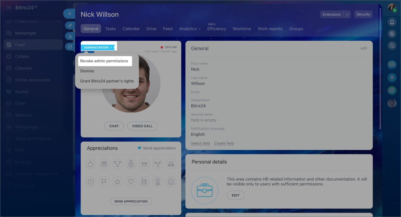 Comment désigner un administrateur Bitrix24 - Dans le plan Basic : l’administrateur principal doit transférer manuellement ses droits à un autre employé. Après le transfert, il deviendra automatiquement utilisateur standard.