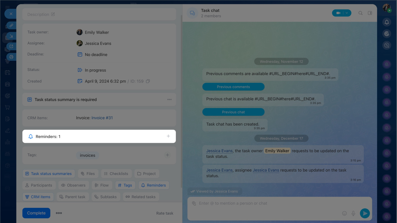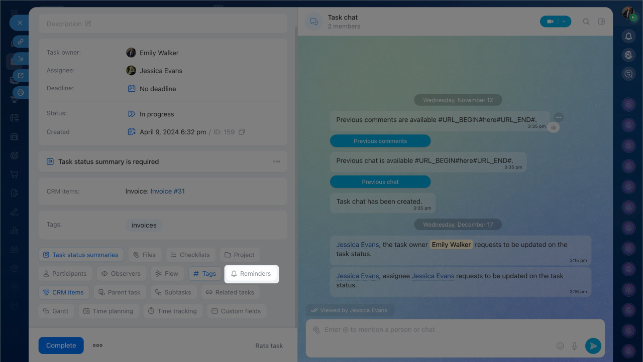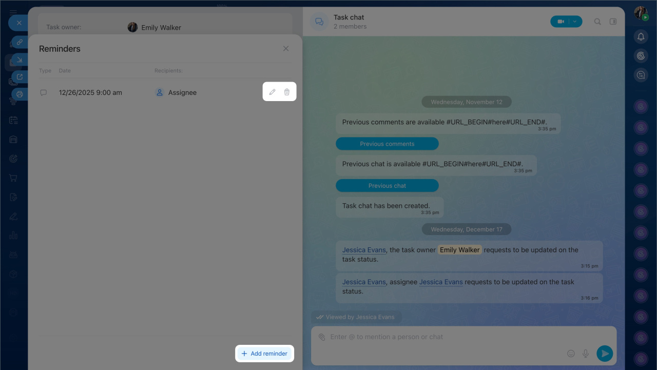 - Tous les rappels créés par un employé sont enregistrés dans la fiche de la tâche. Ouvrez le bloc Rappels pour afficher la liste et modifier, supprimer ou ajouter un rappel.
