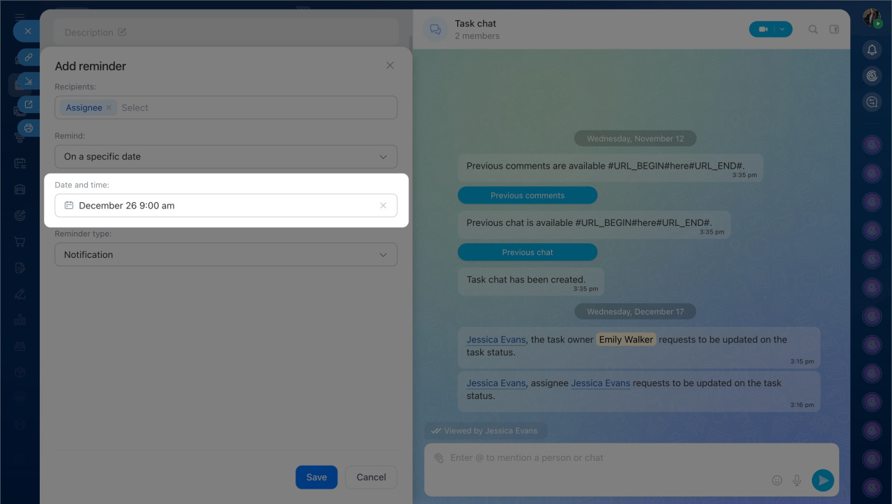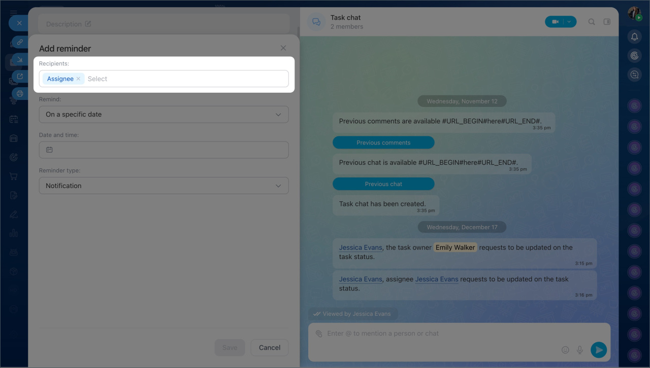 Chaque participant peut ajouter un rappel pour lui-même ou pour ses collègues : responsable, propriétaire de la tâche ou autres participants. Vous pouvez le faire lors de la création ou de la modification d’une tâche.